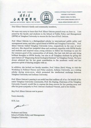 Upon hearing Ostrom’s death, the whole school mourned for the loss of Prof. Ostrom. On behalf of all the SPPM faculty and students, Prof. Xue Lan, Dean of SPPM, extended his deep sorrow for Ostrom’s passing away and offered his great sympathy to Prof. Ostrom’s husband Vincent, and to her family.