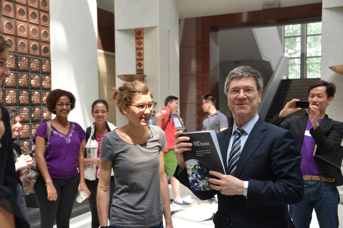 May 15th, Professor Sachs met MID students during his presence in the Sustainable Development Solutions Network’s fourth leadership council at Tsinghua University. He briefly introduced the widely debated issues of sustainable development. Concentrating on MDP’s field training, he advised students on internship and career development in this area and answered some questions. At last, the representatives of MID student presented MIDpoint, an independent publication on international development, initiated by the MID students.