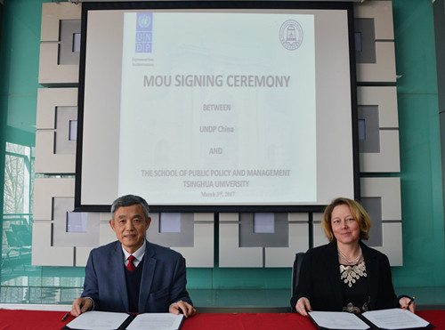 Xue Lan, Dean of SPPM, and Agi Veres, Country Director of UNDP China, jointly concluded the Memorandum of Understanding between the two organizations, which would cooperate with each other in the future in such fields as talent cultivation, high quality SDG training programs that are best suitable for SPPM alumnus, joint research on SDGs, academic exchange, establishment of global network, and practice of UN SDGs.