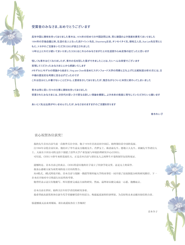 For the award ceremony of “Masahiko Aoki Award for Economic Paper”, Mrs. Reiko Aoki sent a congratulatory letter, which was read by Professor Hoshi Takeo at the ceremony. In the letter, she expressed her sincere congratulations to the award-winning young scholars and conveyed that Professor Masahiko Aoki always paid attention to the research of young scholars during his lifetime. Mrs. Aoki hopes that the new generation of scholars who won the award will be able to build up an updated economic theory with young vitality.