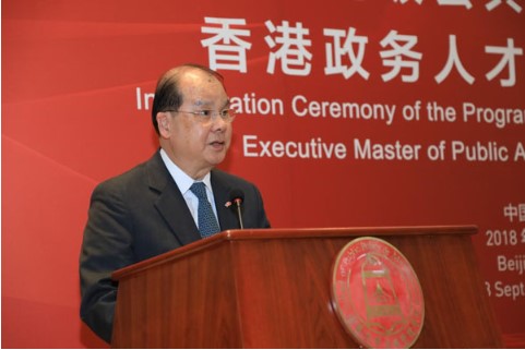 On the afternoon of September 3, the inauguration ceremony of the Executive Master in Public Administration (EMPA),the Program for Hong Kong Public Administrative Talents (hereinafter referred to as " EMPA Program") was solemnly held in the lobby of SPPM. More than 100 people, including Wang Zhimin, Director of the Liaison Office of the Central People's Government in the Hong Kong S.A.R., Chen Xu, Secretary of the CPC Tsinghua University Committee, Matthew Cheung Kin-chung, Chief Secretary for Administration of Hong Kong Special Administrative Region and other leaders, Wang Guangya, Standing Member of National People's Congress Standing Committee and Chairman of National People's Congress Overseas Chinese Affairs Committee, Tam Yiu-Chung , Member of the Standing Committee of the 13th National People's Congress, Tsang Yuk Sing, former Chairman of the Legislative Council of the Hong Kong Special Administrative Region, Mr. Daryl Ng Win Kong, JP, Vice Chairman of Sino Group, and other guests from the National People's Congress, Chinese People's Political Consultative Conference, Hong Kong and Macao Affairs Office of the State Council, Ministry of Education of the People's Republic of China, United Front Work Department of CPC Central Committee, United Front Work Department of Beijing Municipal Committee, Beijing Municipal Committee of the Chinese People's Political Consultative Conference, the Sino Group and Ng Teng Fong Charitable Foundation and Tsinghua University, all freshmen of the EMPA Program, as well as representatives from more than a dozen news media attended the event. The opening ceremony was presided over by Prof. Peng Zongchao, Party Secretary of Tsinghua SPPM.