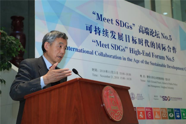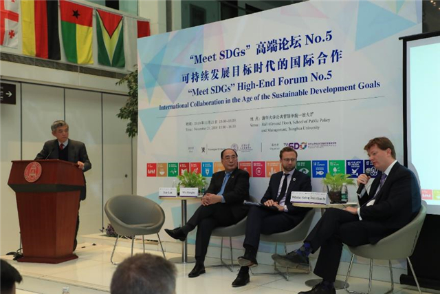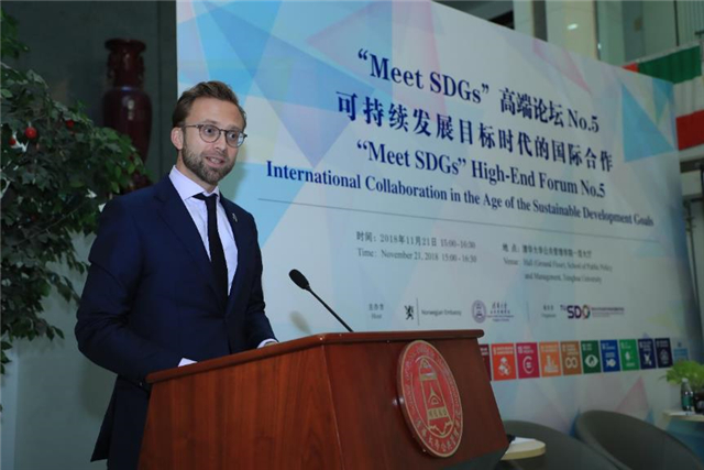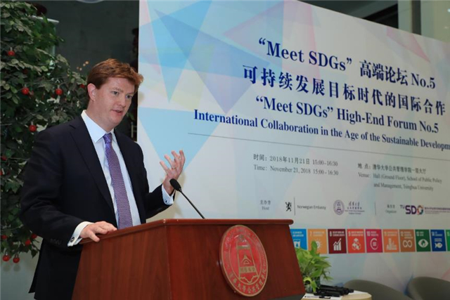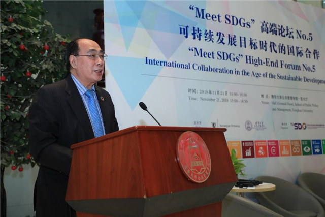 On November 21st, “Meet SDGs” High-End Forum No.5 – International Collaboration in the Age of the Sustainable Development Goals was held at the School of Public Policy and Management (SPPM) at Tsinghua University. This forum was co-hosted by SPPM and Norwegian Embassy in China, and organized by the Institute for Sustainable Development Goals of Tsinghua University (TUSDG). The professor of SPPM, Co-Director of TUSDG, and Dean of Schwarzman College of Tsinghua University, Xue Lan moderated the forum. The professor and Dean of SPPM, Standing Committee Member of the 13th National People's Congress (NPC), and Vice Chairwoman of NPC Social Development Affairs Committee, Jiang Xiaojuan addressed the welcoming speech at the Opening Ceremony. Minister of International Development of Norway Nikolai Astrup, Co-Director of TUSDG and Former UN Under-Secretary-General Wu Hongbo, Vice President and Corporate Secretary of the Asian Infrastructure Investment Bank (AIIB) Danny Alexander, Executive Director of TUSDG Zhu Xufeng, professors and associate deans of SPPM, and more than a hundred audiences attended the forum.