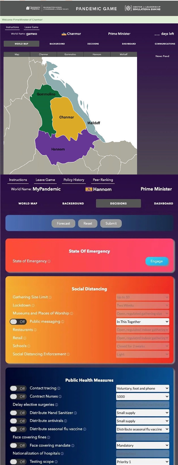 In the day-long event, participants were assigned to five simulated worlds. In each world, students were divided into four teams which represented four fictional countries (Chanmar, Gommolino, Hannom, Malldaff). Within each country, participants role-played as the Prime Minister, Minister of Public Health, Minister of Finance, Minister of Communications, and World Health Organization Representative, working with teammates from different universities to navigate difficult policy decisions and their outcomes.Their decisions impacted not only domestic mortality rates, economies, and political situations, but also regional stability. Teams were evaluated on simulation scores, negotiation skills, and presentations made to judges.