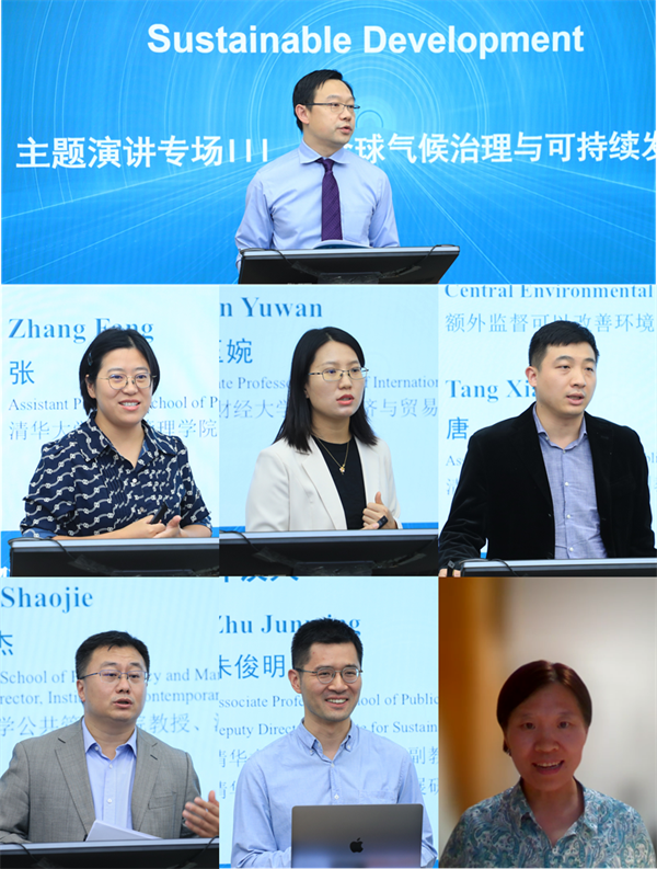 The Panel III “Global Climate Governance and Sustainable Development” was presided over by Gao Yuning. In this panel, Zhang Fang (Assistant Professor, THU-SPPM) took the Belt and Road Initiative as an example to answer questions such as whether clean energy has achieved South-South transfer and etc. Duan Yuwan (Associate Professor, School of International Trade and Economics, Central University of Finance and Economics) shared the test results of the welfare effects of China’s carbon market and the EU Carbon Border Adjustment Mechanism (CABM). Tang Xiao (Associate Professor, THU-SPPM) jointly analyzed the question of whether additional supervision can improve environmental performance from a theoretical model and an empirical level. Zhou Shaojie (Professor, THU-SPPM and Deputy Director, Institute for Contemporary China Studies, Tsinghua University) introduced the progress of Chengdu’s practice of promoting green development. Zhu Junming (Associate Professor, THU-SPPM and Deputy Director, Institute for Sustainable Development Goals, Tsinghua University) and Ren Xiaona (Associate Professor, Beijing University of Agriculture) as discussants, had in-depth reviews on the speeches.
