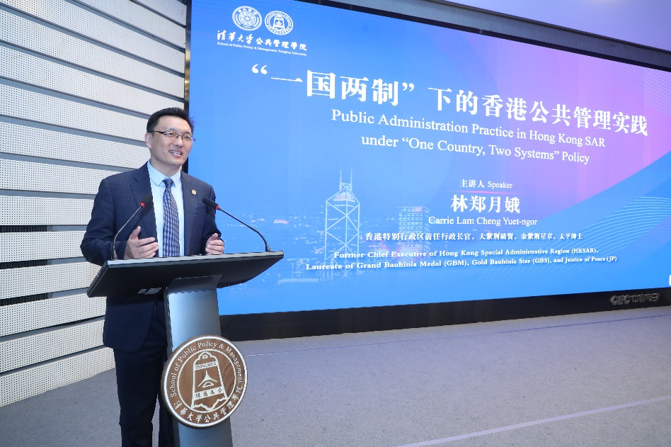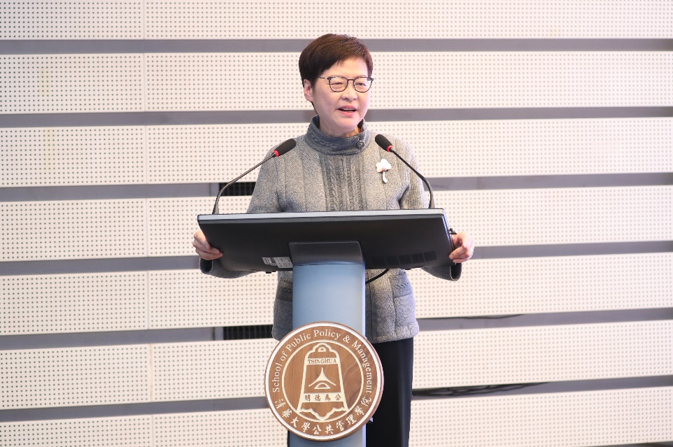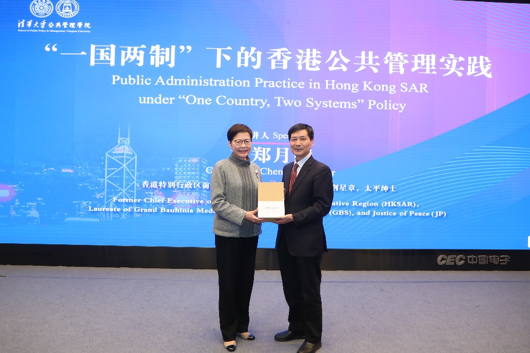 Following her introduction, Madam Carrie Lam explained in detail the importance and necessity of the “One Country, Two Systems” policy in light of the development history of Hong Kong SAR. She emphasized that the “One Country, Two Systems” policy is the foundation of public governance practice in Hong Kong SAR and an essential principle to ensure long-term prosperity and stability for the society in Hong Kong. In order to achieve proper governance in the political system, economic development, legal policies, social welfare, and other important fields, as well as responding calmly and firmly to any challenge or obstacle, the “One Country, Two Systems” policy is the indisputable bottom line. In the future, Hong Kong SAR Government should actively innovate to keep pace with the times, explore more areas of cooperation with Mainland China, exert its advantages whilst also highly integrating into the overall national development scheme, and further advance social justice and public welfare. At last, Madam Carrie Lam encouraged the faculty members and students of Tsinghua SPPM to adhere to the spirit of serving the people, to act bravely and strive forward, with the hopes that the youth in Mainland China and Hong Kong SAR can also actively contribute to the development of China.