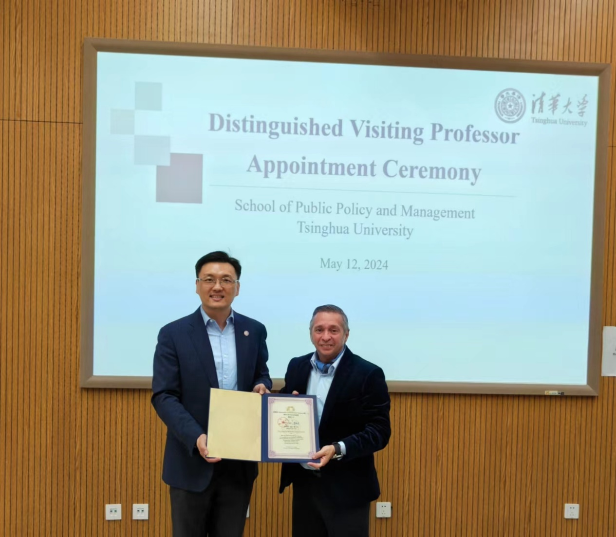 On May 12th, the appointment ceremony for Prof. Alessandro Golombiewski Teixeira as a Distinguished Visiting Professor at Tsinghua University was held. Zhu Xufeng, Dean of the School of Public Policy and Management of Tsinghua University (hereinafter as Tsinghua SPPM), delivered a speech during the ceremony, introducing the biography and achievements of Prof. Alessandro Golombiewski Teixeira, and presented him with the appointment letter signed by Li Luming, President of Tsinghua University. Shi Shuting, Deputy Director of the Office of International Cooperation and Exchange of Tsinghua SPPM, Yang Wen, the Academic Manager for International Programs of the Office of Academic Affairs, and all students participating in the class of “Frontier on Public Policy Study- International Political Economy Analysis” also attended the ceremony.