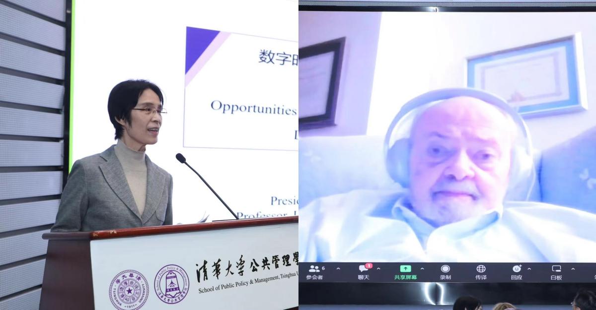 The opening ceremony was followed by two keynote speeches moderated by Zhu Junming, Associate Professor and Associate Dean at Tsinghua SPPM. Jiang Xiaojuan, President of the China Society of Industrial Economics, Professor of the University of Chinese Academy of Social Sciences, and former Deputy Secretary-General of the State Council, presented a keynote speech on the topic of “Opportunities and challenges facing public governance in the digital era: Experience from China”. Guy Peters, Maurice Falk Professor of Government at the University of Pittsburgh and founding President of the International Public Policy Association, gave a keynote speech titled “Two and one-half cheers for technological change in policy”.