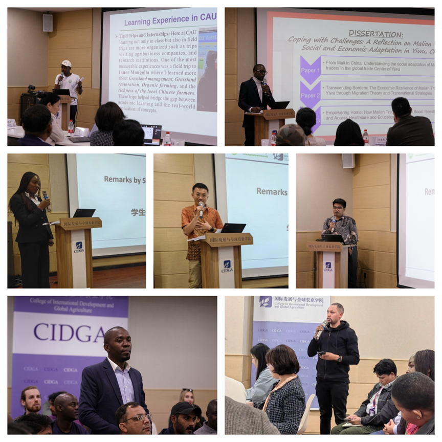 Subsequently, students from both universities engaged in a lively and in-depth exchange. Abdoul Razak Toure and Khamis Abdulla Ali, student representatives from CIDGA, shared their thesis topics and research findings on African merchants' trade activities in Yiwu, as well as their experiences in academic studies and research at China Agricultural University. Tabitha Trency Chakanza (IMPA-MOFCOM program, from Malawi), Yuong Chee Chung (IMPA-BRI program, from Malaysia), and Mostofa Habibil (IMPA-FL program, from Indonesia) introduced their respective programs, student backgrounds, and their personal work-related experiences. Following that, students from both universities engaged in the Q&A session on issues and aspects of mutual concern, deepening the theme of the exchange activity.