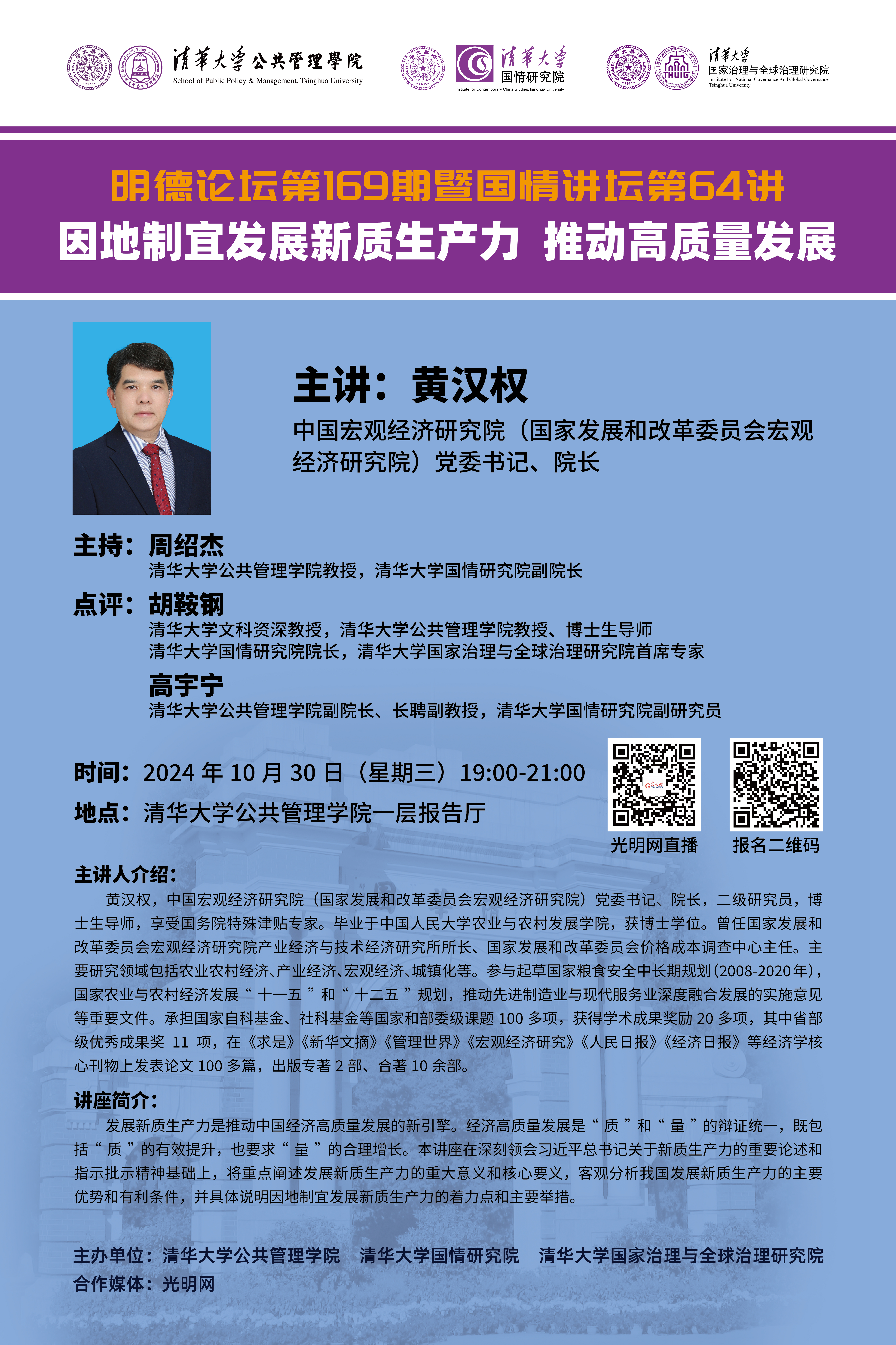明德论坛第169期暨国情讲坛第64期:因地制宜发展新质生产力 推动高质量发展(2024年10月30日 星期三 19:00-21:00)