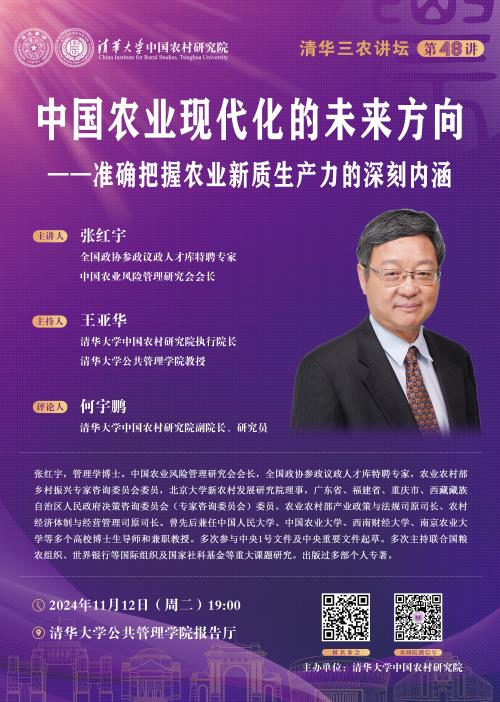 欢迎您参加清华三农讲坛第四十八讲:中国农业现代化的未来方向——准确把握农业新质生产力的深刻内涵(2024年11月12日 星期二 19:00)