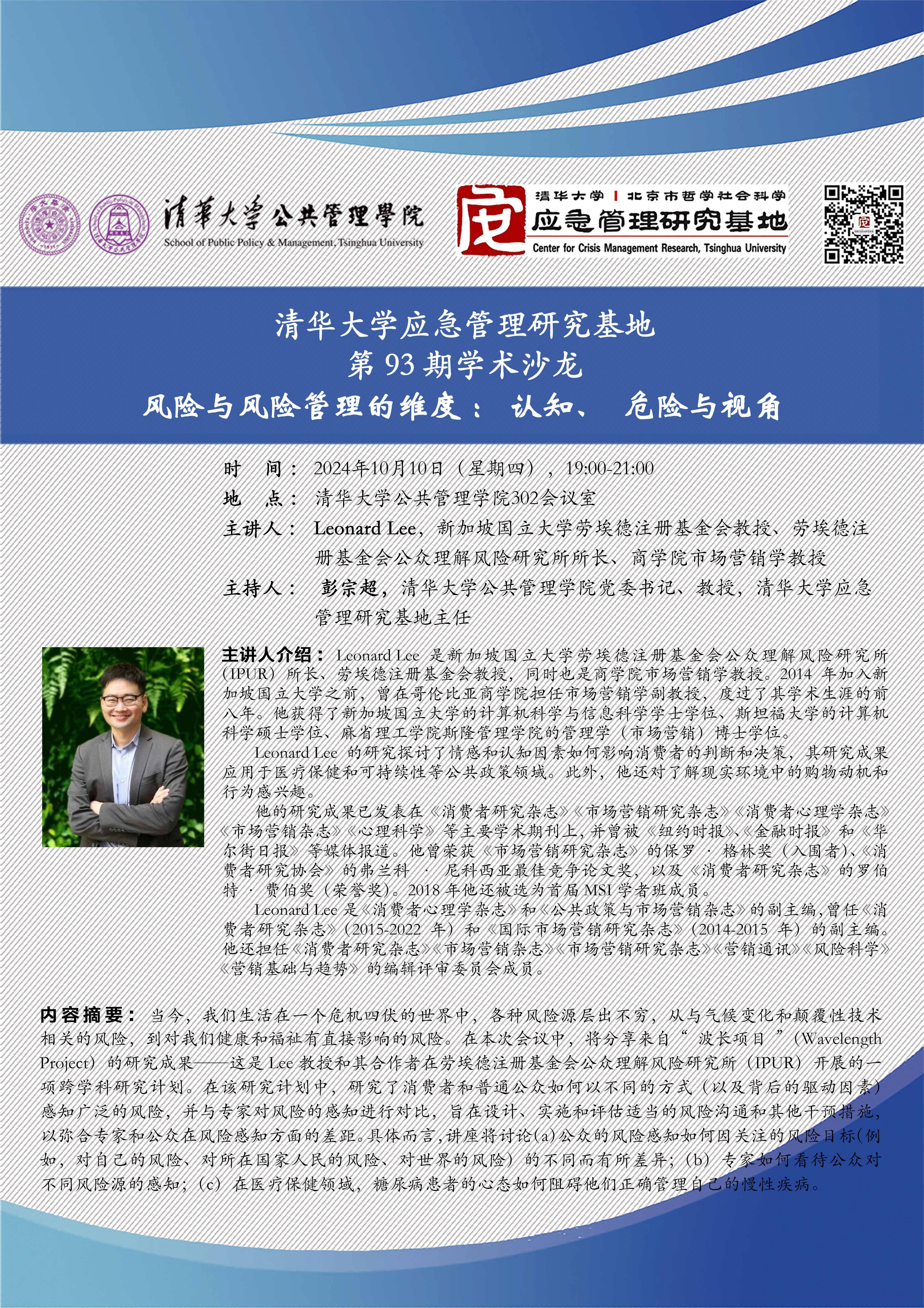 清华大学应急管理研究基地第93期学术沙龙:风险与风险管理的维度:认知、危险与视角(2024年10月10日 星期四 19:00-21:00)