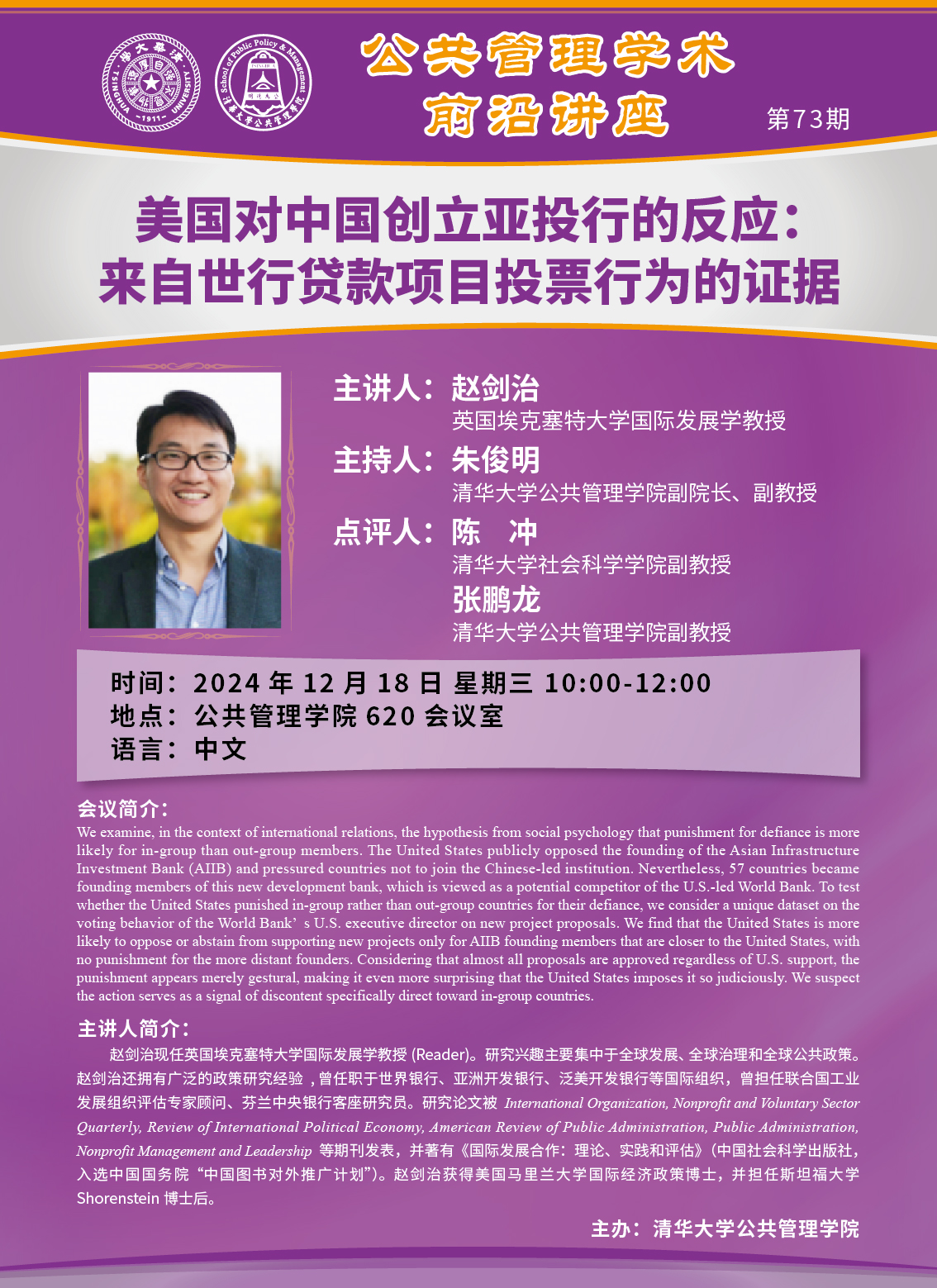 公共管理学术前沿讲座73期:美国对中国创立亚投行的反应:来自世行贷款项目投票行为的证据(2024年12月18日 星期三 10:00-12:00)