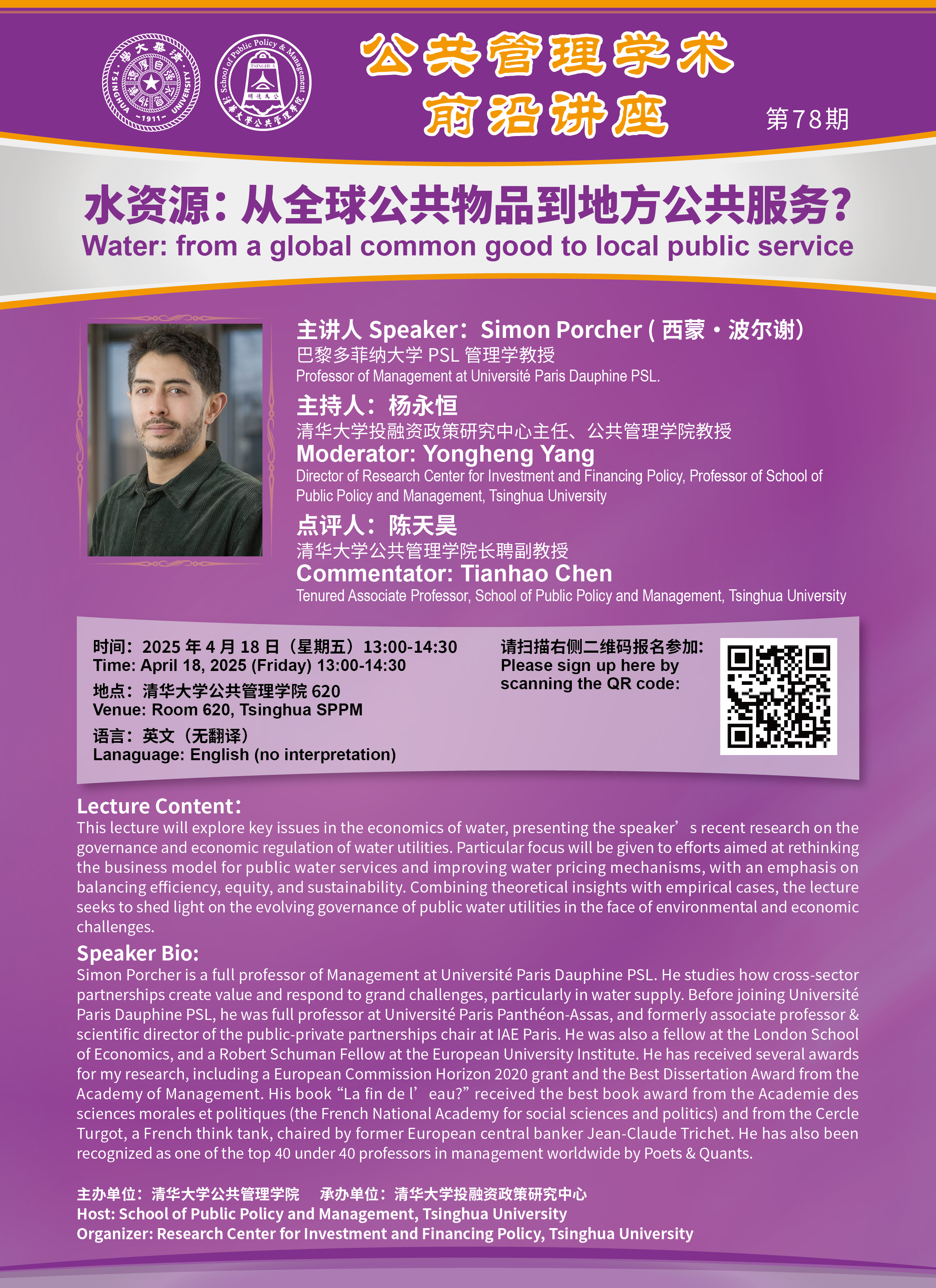 公共管理学术前沿讲座第78期:水资源:从全球公共物品到地方公共服务(2025年4月18日 星期五 13:00-14:30)