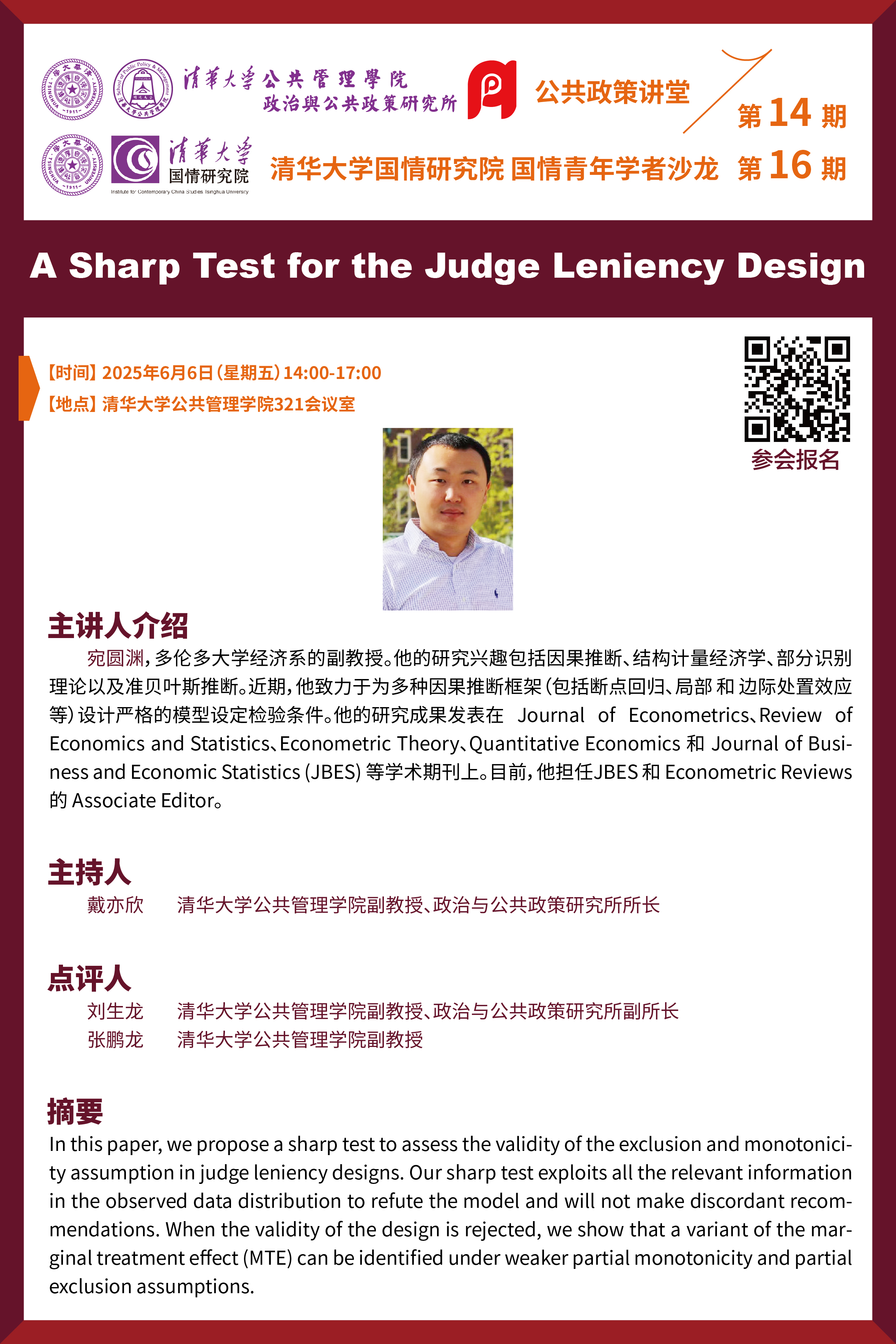 清华大学公共管理学院政治与公共政策研究所公共政策讲堂第14期、清华大学国情研究院国情青年学者沙龙第16期——A Sharp Test for the Judge Leniency Design(2025年6月6日 星期五 14:00-17:00)