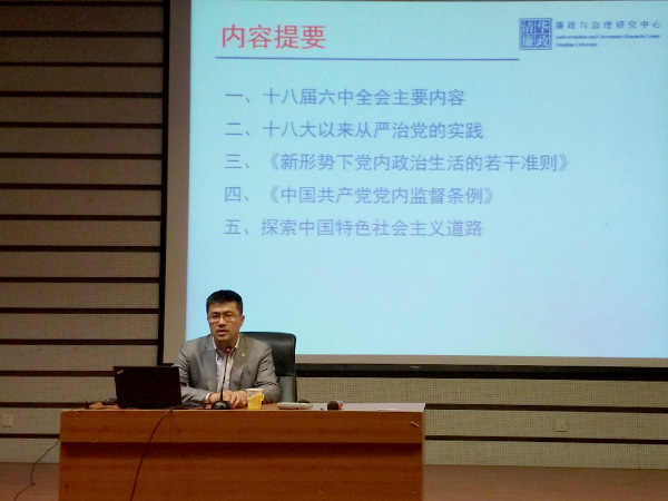 ——加强党风廉政建设 推进全面从严治党 11月17日,清华公管学院党委举办十八届六中全会辅导报告会,邀请清华大学党委常委、公共管理学院党委书记、廉政与治理研究中心副主任过勇副教授作了题为《加强党风廉政建设,推进全面从严治党》的讲座。公管学院党委副书记谢矜主持讲座,党的十八大代表、清华大学国情研究院院长胡鞍钢,公管学院党委委员于安、王有强等学院百余位党员师生参加了本次学习活动。 图为过勇作专题辅导报告。 过勇首先介绍了十八届六中全会的基本情况,指出本次会议的主要内容包括:确立了习近平同志在党内的核心地位,专题研究了全面从严治党问题,正式启动了党的十九大的筹备工作,以及中央委员会的人员调整和组织决定。随后,过勇通过分析国内外的反腐形势及多个实际案例,解读了十八大以来全面从严治党的实践和发展情况。十八届六中全会通过了《关于新形势下党内政治生活的若干准则》和《中国共产党党内监督条例》两个重要文件,过勇通过背景介绍、问题导向、新旧条例对照、与西方国家的比较等方式,对其分别进行了详细解读。 过勇指出,坚持中国特色反腐倡廉道路就是要坚持中国特色社会主义的“四个自信”。通过对世界各国腐败状况的分析...
