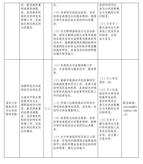 有意应聘者请登录清华大学招聘网(http://jobs.tsinghua.edu.cn/project/qhdx/pages/recruit_new/?#/post),招聘单位栏点击“智库中心”,在招聘系统中应聘,并同时发送要求材料至各机构联系邮箱。截止日期以清华大学人员招聘系统发布为准。