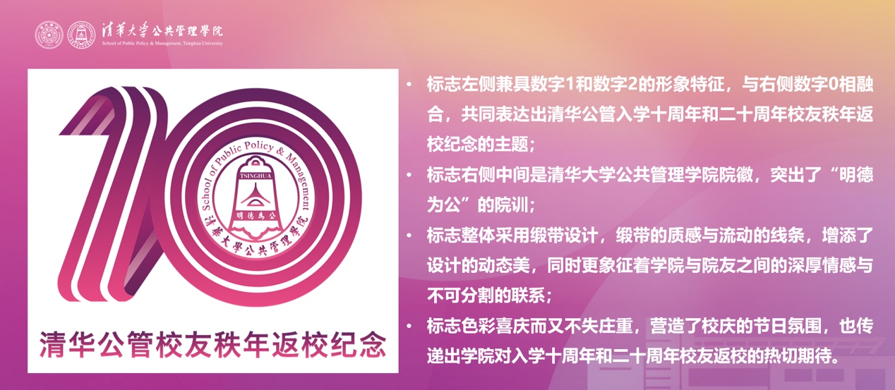 接下来,彭宗超揭幕了秩年返校Logo设计样式。经过学院设计、院友线上投票最终选出的Logo样式生动表达了清华公管入学十周年和二十周年校友秩年返校纪念的主题。该Logo将用于今后每年校庆时期迎接秩年返校校友的各项活动中。