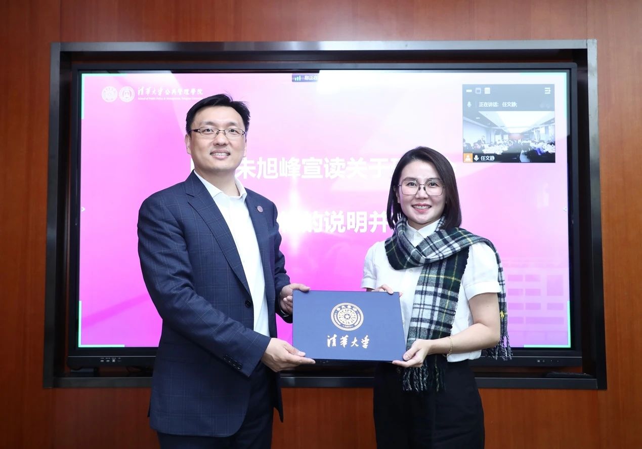 随后,朱旭峰宣读了《关于理事会理事增补的说明》。通过学院推荐、定向邀请及现场表决,“未来领袖”国际公共管理硕士项目校友王晓庭作为新任理事进入理事会。朱旭峰为王晓庭颁发证书。