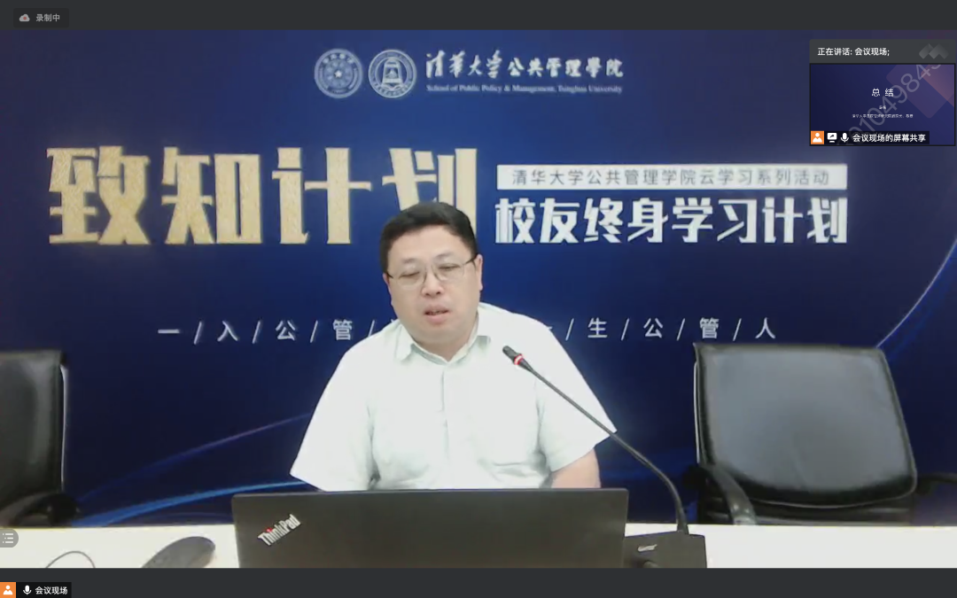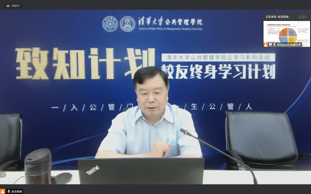 8月22日,清华大学公共管理学院第七期校友终身学习计划(致知计划)在线上举行。本次终身学习计划主题为“新冠疫情防控与医药卫生管理”,特别邀请清华大学医院管理研究院常务副院长张宗久教授,公共管理学院潘洁教授、夏诚华教授作主题报告,讨论新冠肺炎疫情防控中的中国方案与社会治理。公共管理学院党委书记彭宗超教授、医院管理研究院副院长薛镭教授出席。200余位公管学院和医院管理研究院校友、在校师生在线参加。论坛由公管学院党委副书记、副院长谢矜主持。