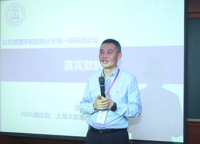 致知计划得到了上海大发地产集团有限公司的大力支持。公管学院2001级校友、上海大发地产集团有限公司执行总裁廖鲁江代表支持单位致辞。他表示,作为校友,自己非常怀念在公管读书的日子,也非常愿意能够有机会再回到学院,以学生的身份与老师和同学们深入交流,吸取最新的知识和技能。因此,他希望尽自己的绵薄之力帮助学院和校友们搭建平台,增强彼此的沟通。