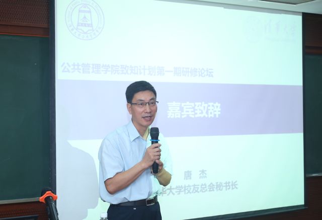 随后,清华校友总会秘书长唐杰发表致辞。他首先肯定了公共管理学院举办致知计划的重要意义和价值,并预祝公管学院的校友工作能够更好地为校友们服务。接着他从有传统、有高度、有基础、有文化、有主题、有温度、有体系、有广度等八个方面介绍了清华校友工作的丰富涵义,并期待更多校友能够借助致知计划这一平台,群策群力,回馈母校。