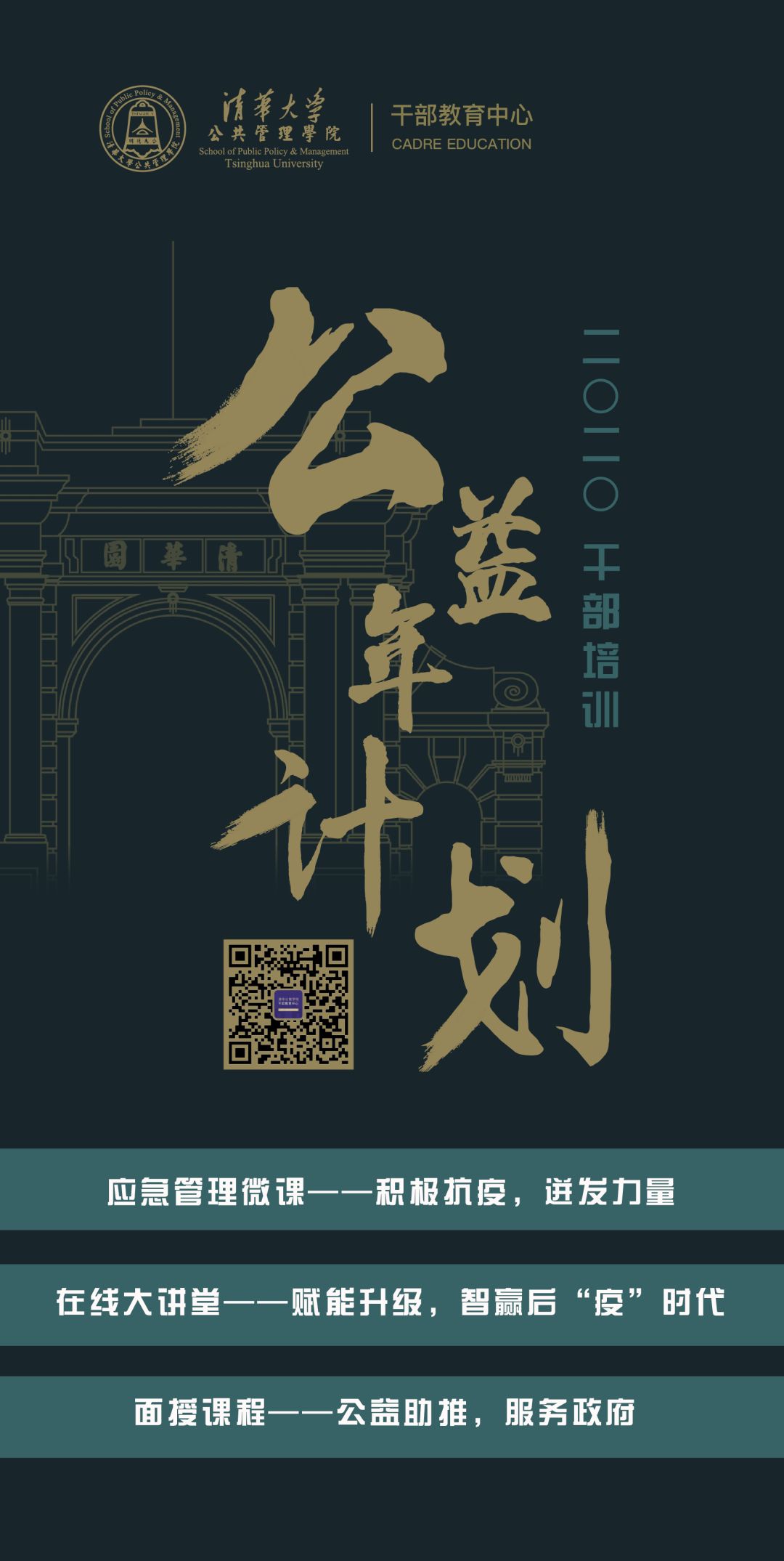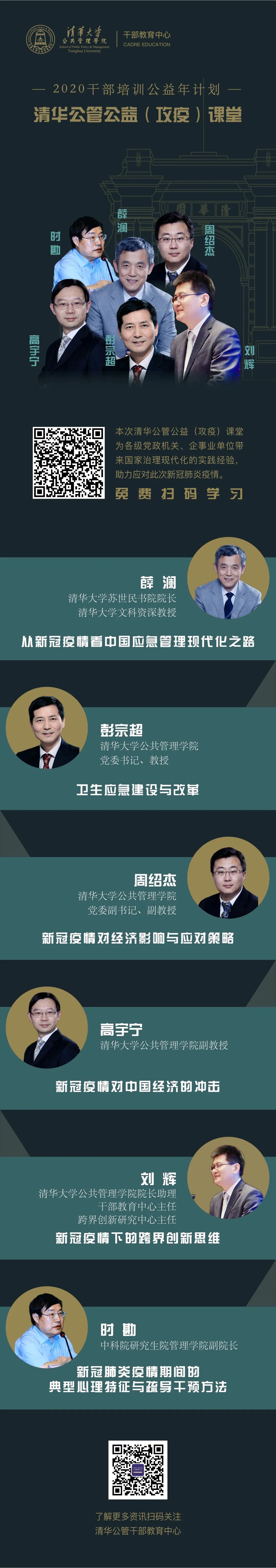清华大学公共管理学院作为专业化院系,积极发挥公管学科优势,整合学院专家资源,科学精准开展疫情防控,提高应急管理体系和能力现代化建设,面向地方政府推出“2020干部培训公益年计划暨应急管理体系和能力现代化公益课堂”。公益年计划是由疫情应对的在线微课、疫情后推进经济社会发展的直播课程、复工复产后联合各级组织部门共同开设的公共管理面授课程三个部分组成。