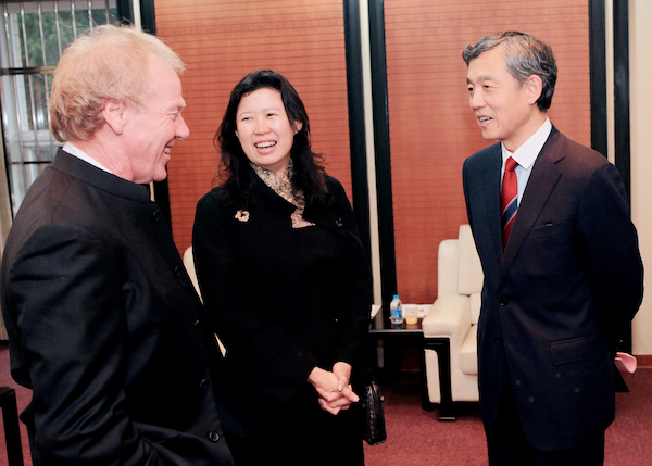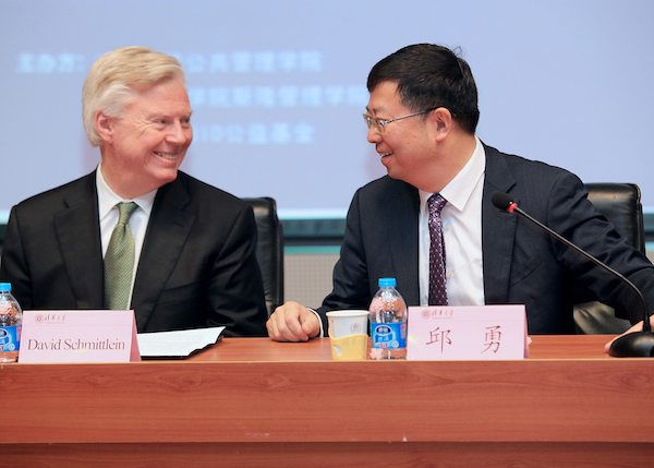 △图为清华大学公共管理学院院长薛澜与MIT斯隆管理学院院长David Schmittlein进行交流