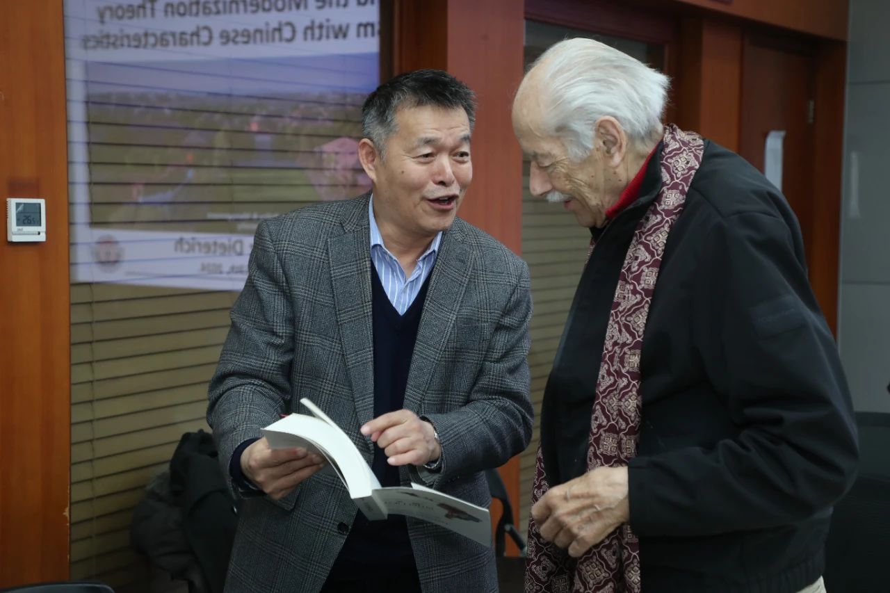 胡鞍钢向Heinz Dieterich赠送了赵忆宁所著的《“一带一路”拉美十国行记》,该书收录了赵忆宁对Heinz Dieterich的访谈内容,围绕社会主义的前途命运展开讨论