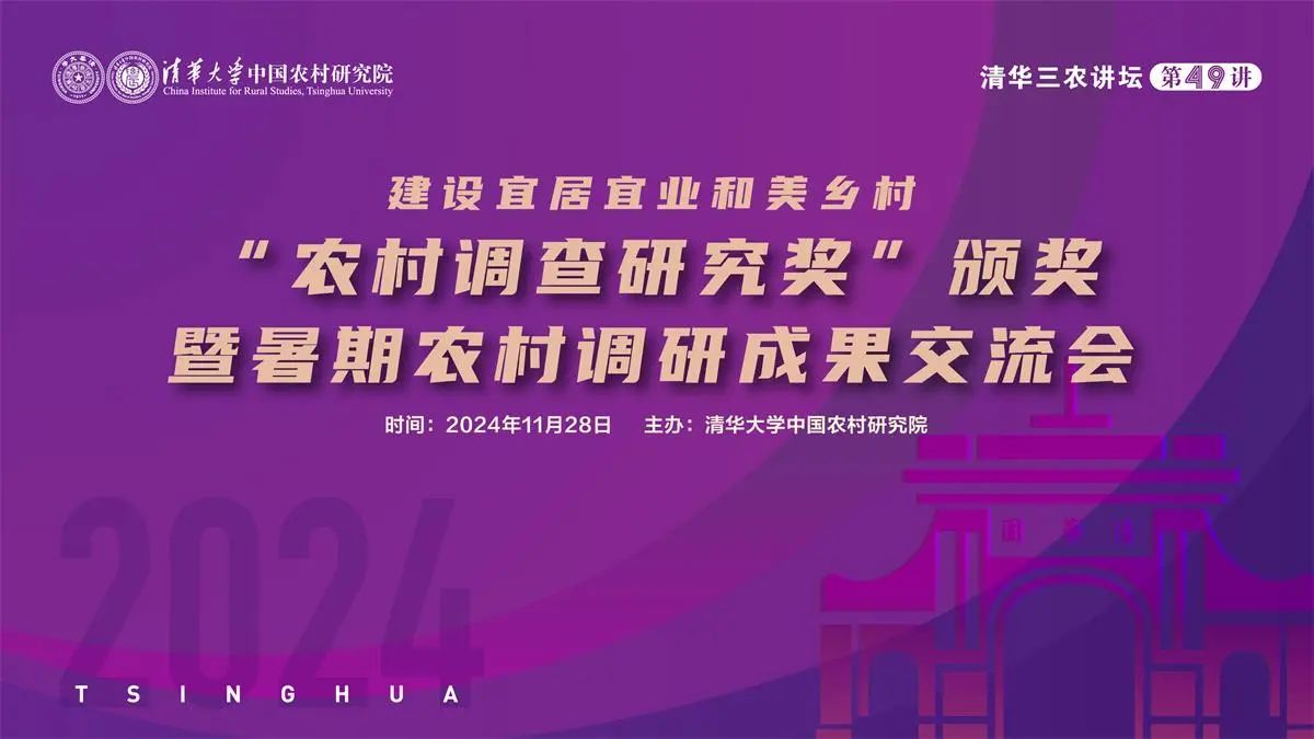11月28日晚,“清华三农讲坛”第四十九讲——2024年“农村调查研究奖”颁奖暨暑期农村调研成果交流会在清华大学公共管理学院报告厅举行。清华大学中国农村研究院执行院长王亚华教授介绍了活动情况。清华大学中国农村研究院副研究员陈思丞,清华大学智能社会治理研究院助理研究员舒全峰点评调研成果。清华大学中国农村研究院副院长魏唯宣布获奖名单。清华大学中国农村研究院副院长何宇鹏研究员、清华大学团委副书记傅宇杰等为获奖团队颁奖。
