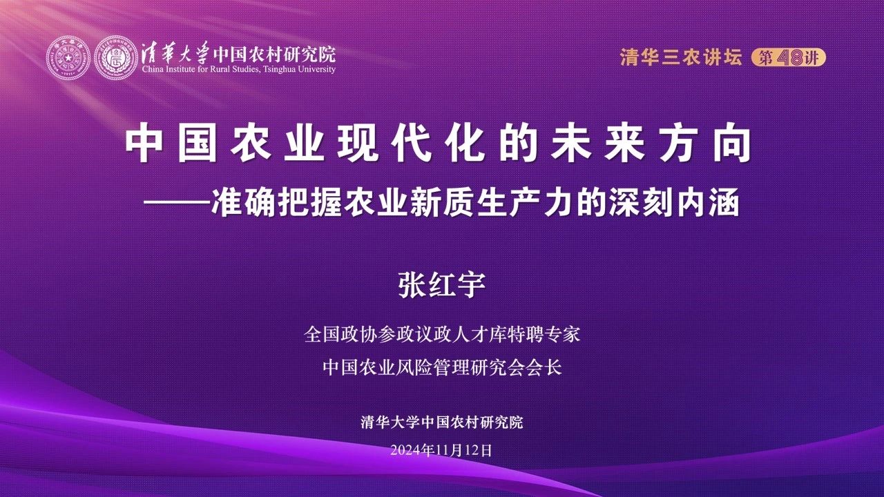 11月12日,“清华三农讲坛”第四十八讲在清华大学公共管理学院报告厅举行。全国政协参政议政人才库特聘专家、中国农业风险管理研究会会长张红宇作了“中国农业现代化的未来方向——准确把握农业新质生产力的深刻内涵”主题演讲。清华大学中国农村研究院执行院长、清华大学公共管理学院教授王亚华主持讲坛,清华大学中国农村研究院副院长、研究员何宇鹏进行评论。