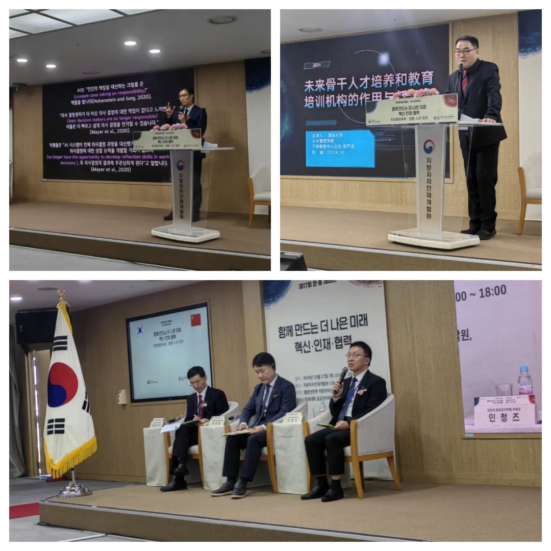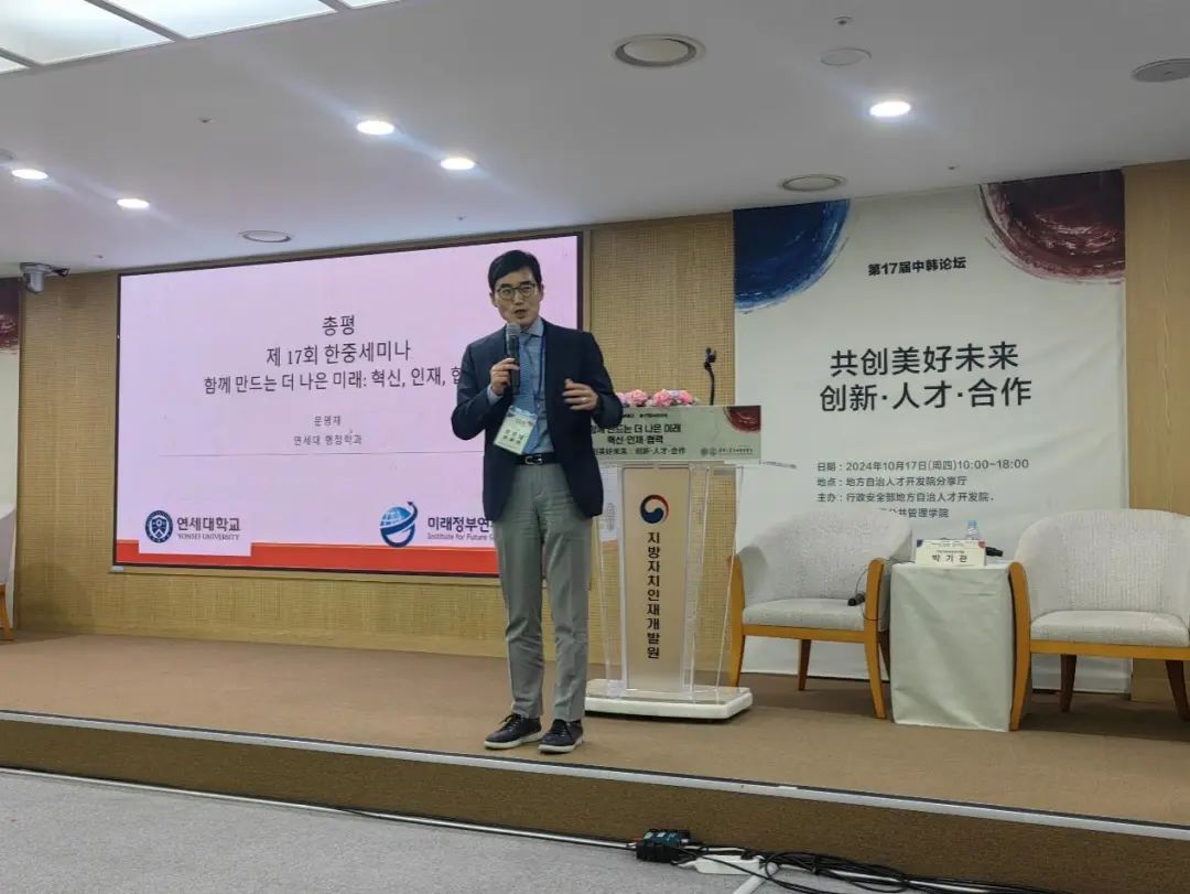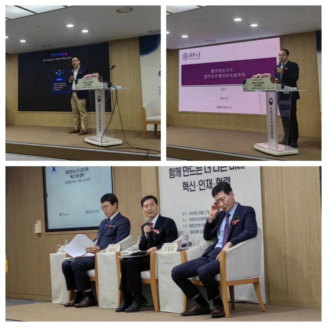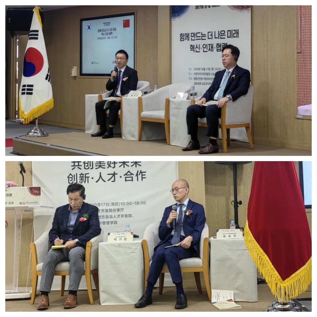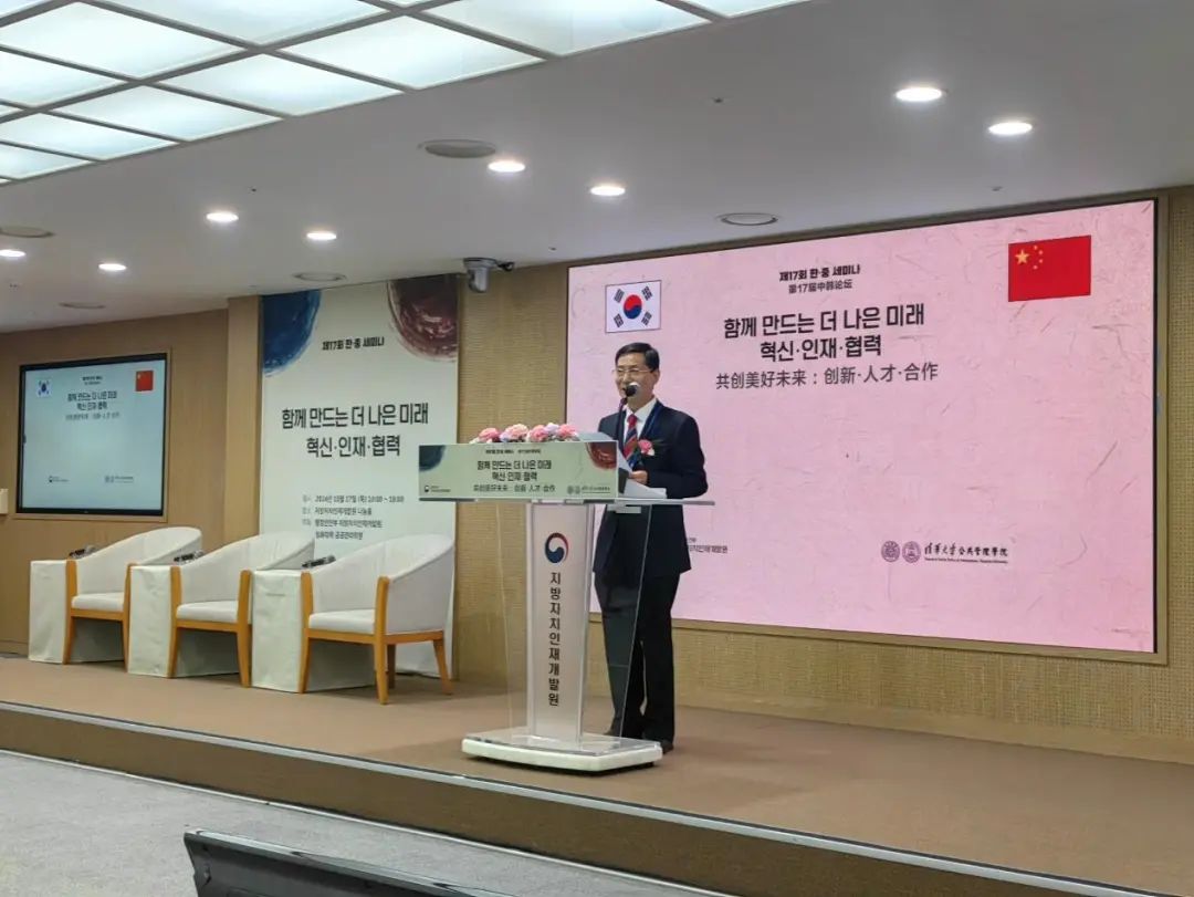 10月17日,由韩国内政安全部地方自治人才开发院(행정안전부,지방자치인재개발원,英文简称“LOGODI”)和清华大学公共管理学院(简称“清华公管学院”)共同主办的“第十七届中韩国际论坛”在韩国全罗北道全州市成功举办。本届会议的主题是“共创美好未来—创新·人才·合作”,来自中韩两国的学者代表参会,就与中韩两国切实相关的话题进行交流和深入探讨。清华公管学院党委书记彭宗超、教授巫永平、副院长殷成志、副教授李应博、干部教育中心主任张严冰,以及清华大学社会科学学院(简称清华社科学院)副院长孟天广应邀赴韩参加。清华公管学院院长朱旭峰以视频方式向论坛致贺词。
