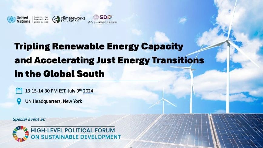 2024年7月9日下午(纽约时间),在2024年联合国可持续发展高级别政治论坛(HLPF)期间,联合国经济和社会事务部(UN DESA),气候工作基金会(CWF)与清华大学全球可持续发展研究院(清华SDG研究院)共同主办了HLPF边会——加速全球南方国家的能源转型。本次会议旨在为全球气候与能源领域专家提供一个交流平台,探讨低碳发展战略、能源转型、可再生能源部署,以及其他缓解气候变化必须采取的优先事项,以助推全球公正能源转型目标。