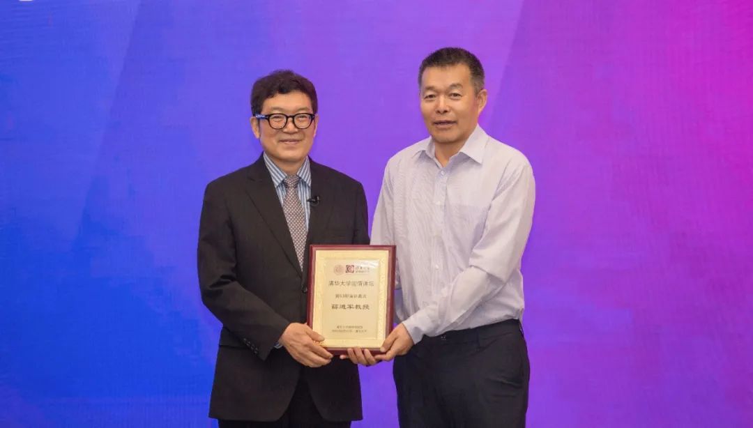 胡鞍钢向薛进军赠送清华大学“国情讲坛”纪念证书并合影留念