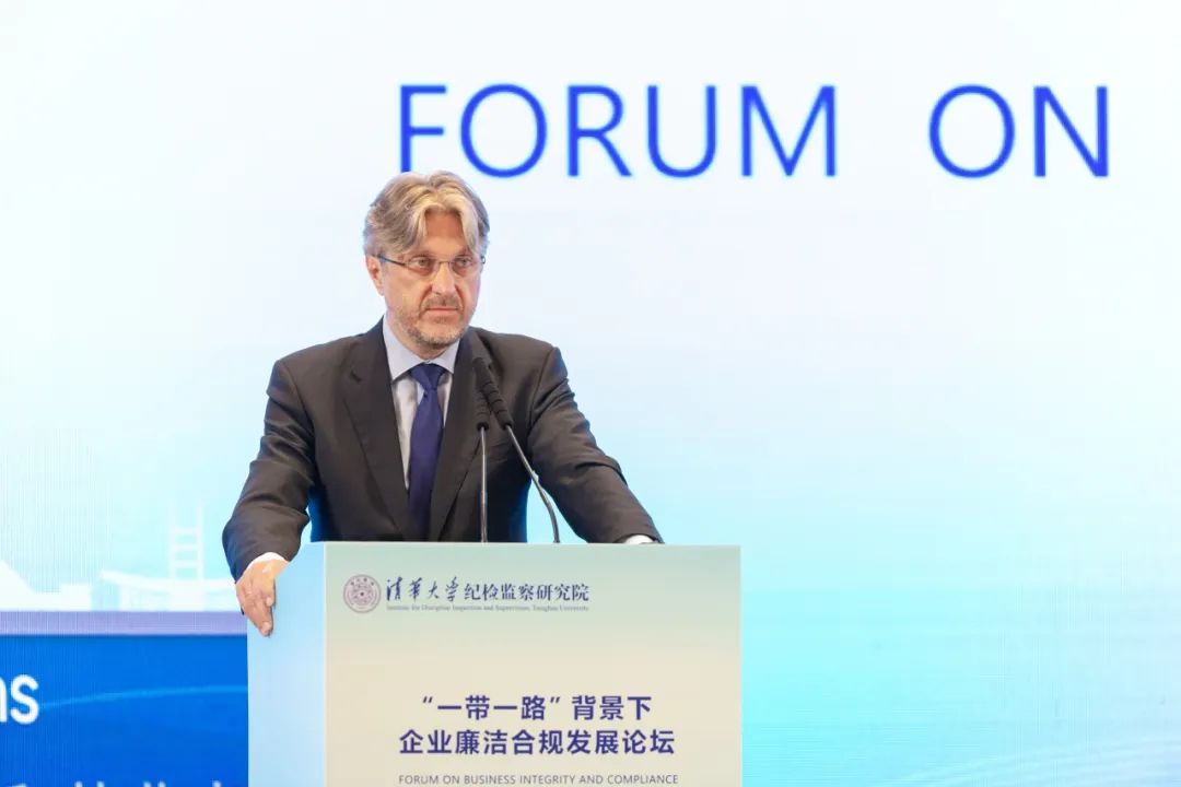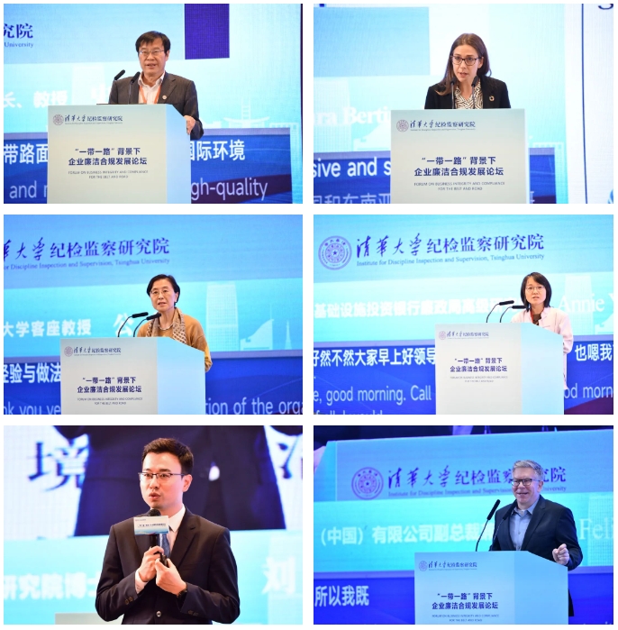 在主旨演讲环节,清华大学“一带一路”战略研究院执行院长史志钦教授围绕着“一带一路”未来十年的机遇与挑战做了交流。他指出,民营企业已成为“一带一路”建设中越来越重要的力量,未来应从宏观政策和国际公共产品维度推动共建“一带一路”高质量发展。联合国毒品和犯罪问题办公室腐败与经济犯罪战略咨询专家Laura Bertipaglia围绕着企业开展廉洁合规建设的新挑战及应对措施,做了深入分享。她提出,应从建立定期性的反腐败对话机制、为企业创建有效的商业诚信和道德合规计划、促进学术界与私营部门的互动等方面,打击商业犯罪,促进商业诚信。香港城市大学客座教授公婷指出,企业合规有助于促进经济发展、推动法治建设、提升社会信任、维护社会和谐稳定,并从打击、预防和教育三个维度总结了香港企业廉洁合规的理论发展与实践探索。亚洲基础设施投资银行廉政局高级研究专家Annie Yau基于亚投行的战略定位,围绕着亚投行合规局的发展历史、理念和廉政策略,对亚投行企业廉洁合规经营战略与规划做了介绍。清华大学纪检监察研究院刘懿博士分析了企业廉洁合规的全球趋势,阐述了加强企业廉洁合规建设的中国方案。西门子(中国)有限公司副总裁兼合规总监Felix Hess做了题为“西门子合规:最新发展”的报告,向参会嘉宾介绍了西门子公司的合规建设历史、合规体系、合规组织、合规程序和道德理念。主旨演讲环节由北京廉政建设研究基地副主任宋伟教授主持。
