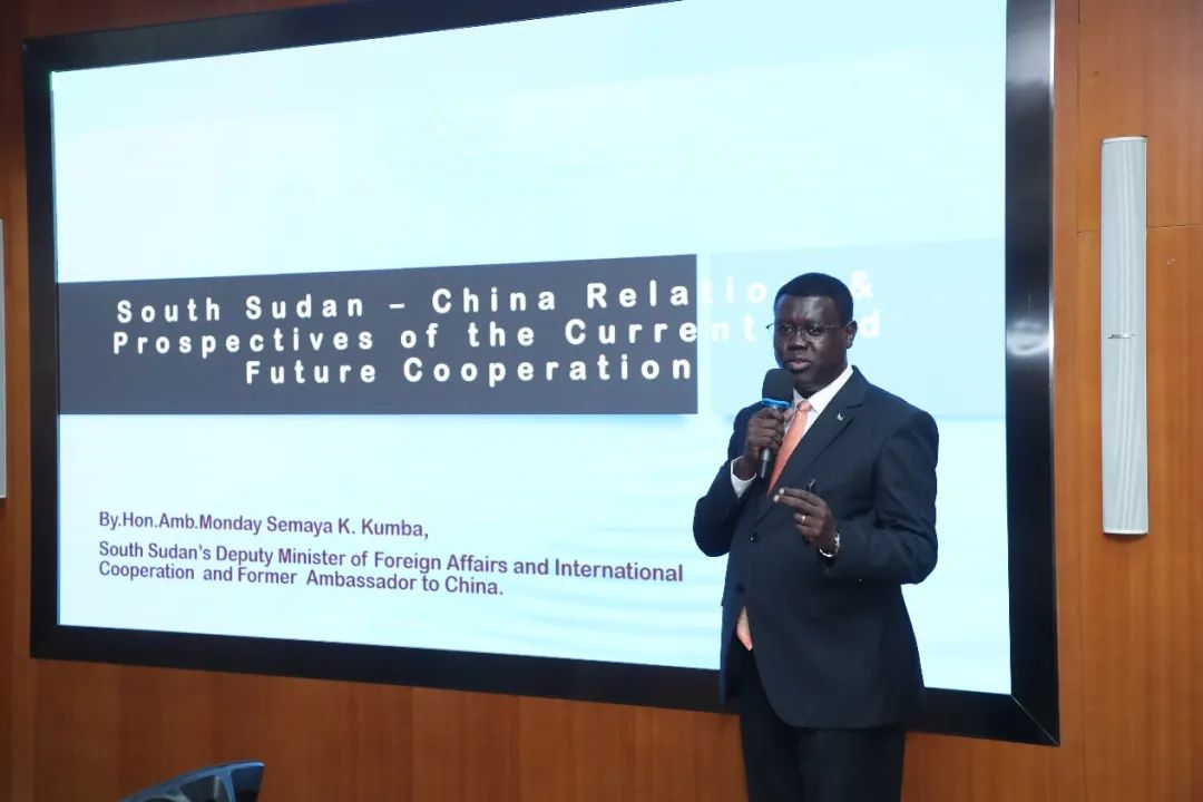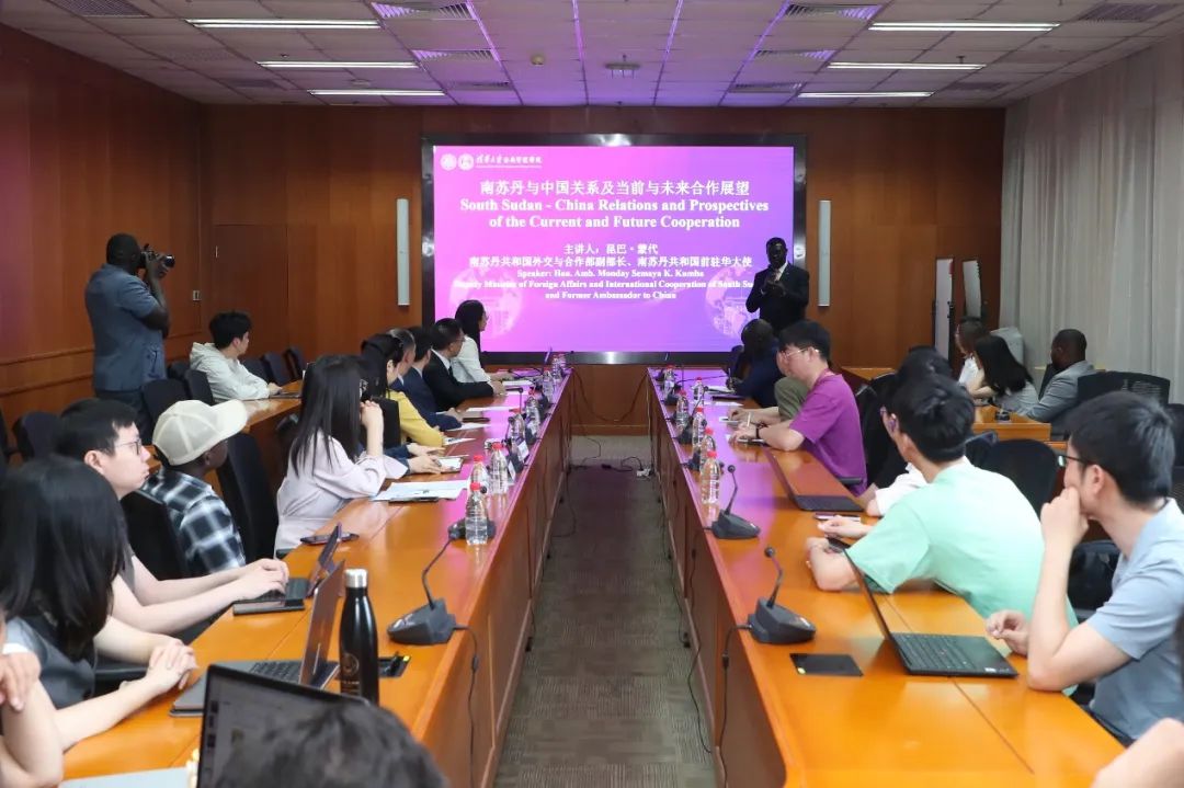 5月21日上午,南苏丹共和国外交与合作部副部长、南苏丹共和国前驻华大使Monday Semaya K. Kumba(昆巴·蒙代)一行到访清华大学公共管理学院(下称“清华公管学院”),并为在校师生做《南苏丹与中国关系及当前与未来合作展望》主题讲座。Monday Semaya K. Kumba (昆巴·蒙代)曾于2010-2011年就读于清华公管学院国际公共管理硕士(IMPA)项目。清华公管学院院长朱旭峰、副院长殷成志、国际项目高级主任郭新宁、国际合作与交流办公室副主任史姝婷等出席接待,30余名中外学生及校友参加。讲座由殷成志主持。
