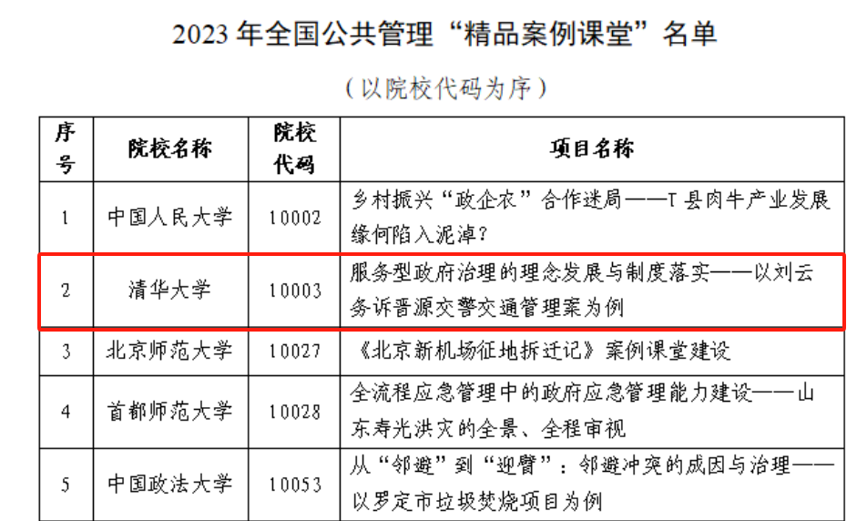 近日,受教育部学位与研究生教育发展中心委托,由全国公共管理专业学位研究生教育指导委员会开展的2023年全国公共管理“精品案例课堂”建设项目,完成了验收评审工作。经过严格的文本检查、专家评审、教指委会审议及投票等环节,在全国范围内共评选出“精品案例课堂”15项,“优质案例课堂”37项。清华大学公共管理学院陈天昊副教授作为首席专家申报项目《服务型政府治理的理念发展与制度落实——以刘云务诉晋源交警交通管理案为例》,获评2023年全国公共管理“精品案例课堂”。
