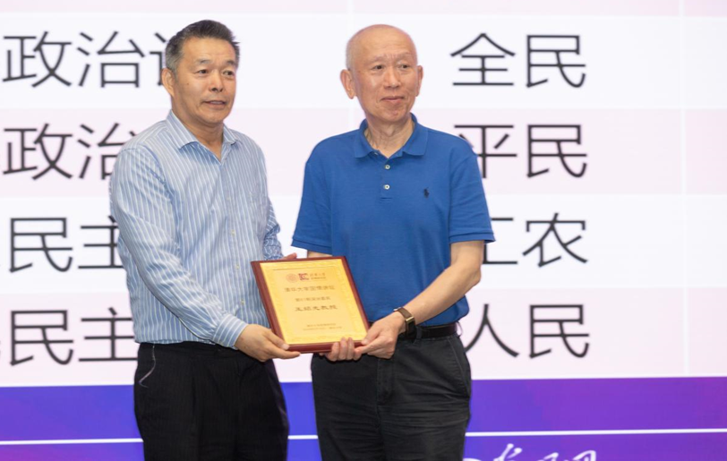 胡鞍钢向王绍光赠送清华大学“国情讲坛”纪念证书并合影留念