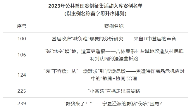 近日,中国专业学位案例中心2023年公共管理案例征集活动入库案例名单公布,我院5篇申报案例全部成功入选,成果喜人。5篇案例分别来自我院蓝志勇、陈思丞、于安、慕玲、张楠、王盈盈、殷成志、齐晔老师团队(以案例名称首字母升序排列)。祝贺以上团队!