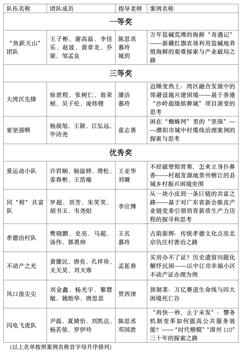 陈思丞副教授、邓国胜教授指导尹磊等同学组成的“闪电飞虎队”,王名教授、慕玲老师指导樊晓鹏等同学组成的“孝德治村队”,孟延春副教授指导黄健民等同学组成的“不动产之光”队,贾西津副教授指导刘金鑫等同学组成的“风口浪尖尖”队,王亚华教授、刘璐老师指导许君娴等同学组成的“爱运动小队”,李应博副教授指导罗超等同学组成的“同‘柑’共富队”荣获大赛优秀奖。