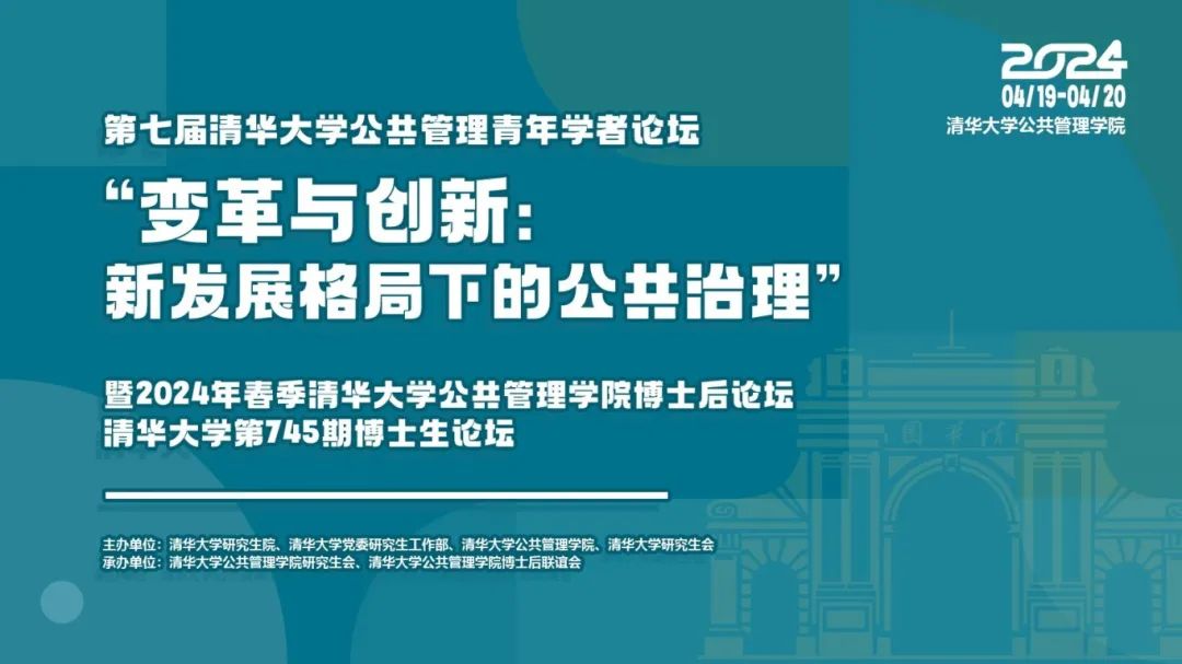 2024年4月19日-20日,在清华大学113周年校庆来临之际,第七届清华大学公共管理青年学者论坛暨2024年春季清华大学公共管理学院博士后论坛、清华大学第745期博士生论坛在公管学院成功举办。本届论坛以“变革与创新:新发展格局下的公共治理”为主题,由清华大学研究生院、清华大学党委研究生工作部、清华大学公共管理学院、清华大学研究生会主办。来自全国部分高校的特邀嘉宾、国内外期刊主编、青年学者以及公共管理学院院友出席论坛。学院党委书记彭宗超、院长朱旭峰、党委副书记兼副院长谢矜、党委副书记周绍杰等与部分师生也参加了论坛交流。