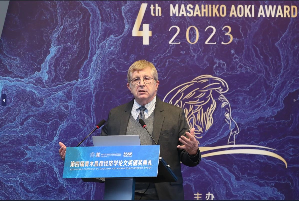 美国加州大学圣地亚哥分校全球政策与战略学院苏君乐讲座教授,CIDEG学术委员Barry Naughton教授作为评审委员进行了发言。Naughton教授首先强调了青木昌彦教授在个人品质和学术领域的卓越成就,特别是其在比较制度分析方面的贡献。他提到青木昌彦教授的开放性思维和对知识探索的热情,对于理解和解决全球性问题具有重大意义。