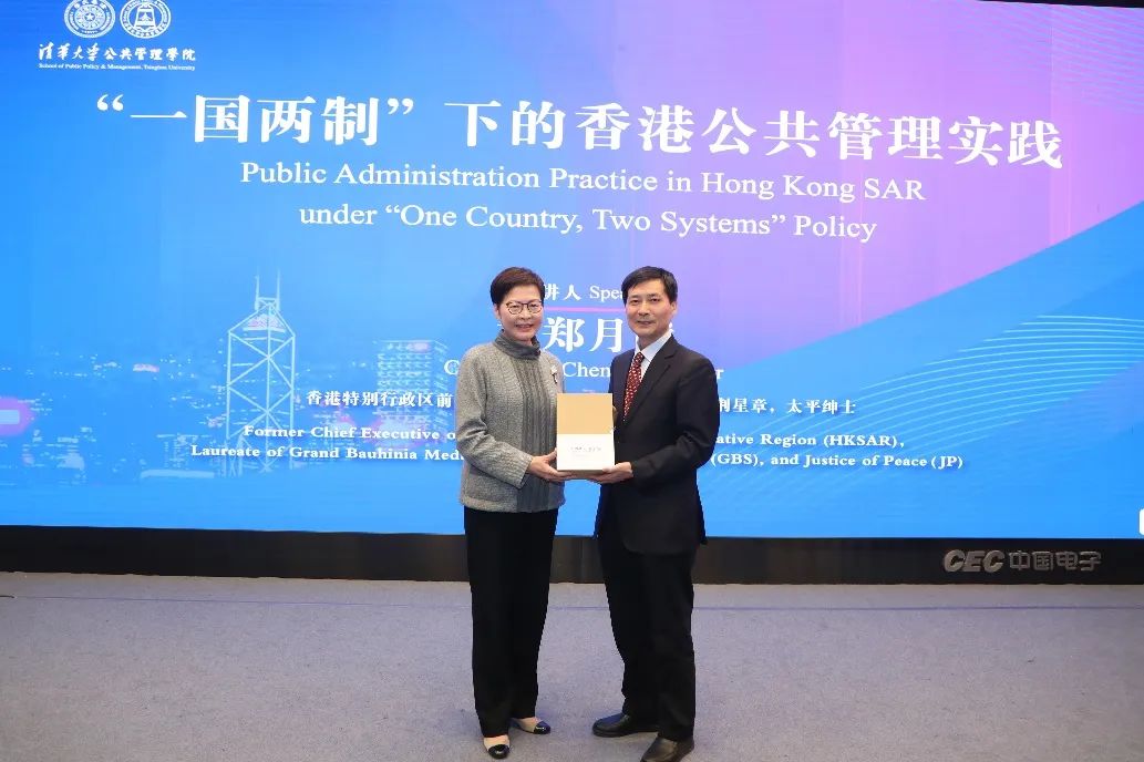 林郑月娥首先回顾了在任期间两次到访清华大学的经历以及学生时代到清华大学进行交流的经历。她表示,此次能够以“公共管理践行者”的身份再度来访,并同公共管理领域的专家学者及青年学子们进行交流,她感到十分亲切和期待。