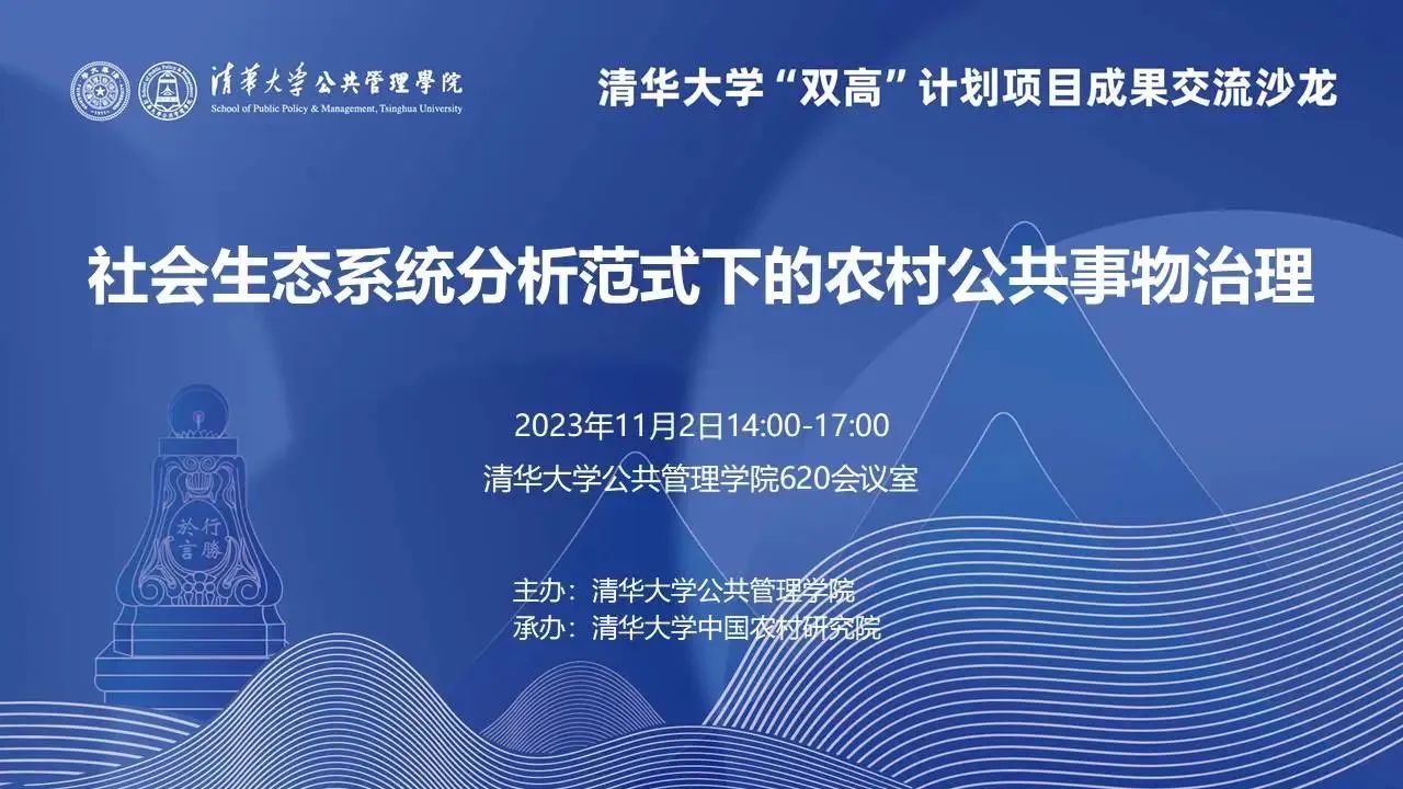 时值清华大学公共管理学院建院23周年之际,学院承接的多项清华大学文科建设“双高”计划项目分别举办成果交流沙龙。2023年11月2日下午,由清华大学中国农村研究院承办的“社会生态系统分析范式下的农村公共事物治理”专场沙龙举行。清华大学文科建设处处长、清华大学公共管理学院教授杨永恒出席并致辞。清华大学公共管理学院副院长、副教授朱俊明作总结。项目负责人、清华大学公共管理学院副院长、清华大学中国农村研究院执行院长王亚华教授主持沙龙,并作成果报告。
