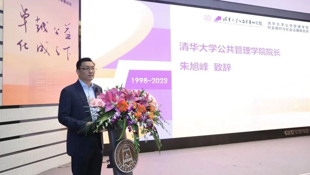 清华大学公共管理学院教授、院长朱旭峰致辞,他代表清华大学公共管理学院向各位嘉宾和校友表示热烈欢迎,对王名、邓国胜、刘求实、贾西津等诸位老师引领的清华NGO研究团队25年来为公共管理学院、公共管理学科的贡献表示感谢,对公益慈善领域专家学者与实践者的公益情怀表示敬意。他在致辞中提到,正是兄弟院校各位同仁与清华NGO研究团队相互支持、相互砥砺,使非营利与慈善研究走到主流,成为公共管理学科非常重要的一部分。面向未来,朱旭峰表达了对青年学者的鼓励,希望他们能够传承老一代学人的开拓精神,在共同富裕、中国式现代化新的时代背景和话语下,结合中华传统优秀文化,守正创新,为中国公益慈善事业的未来贡献更多智慧。