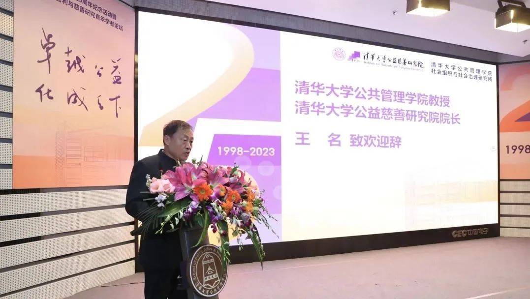 清华大学公共管理学院教授、清华大学公益慈善研究院院长、清华大学NGO研究中心创设人王名致欢迎辞,他对各位嘉宾对清华NGO研究的关注、支持和厚爱表示感谢,他从“天时、地利、人和”三个维度回顾了清华NGO研究25年发展历程,并对中国非营利与慈善领域的青年研究者寄予了厚望,表达了对未来公益慈善研究的期望。