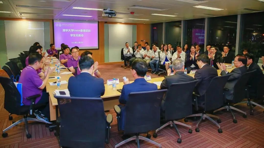 10月1日至3日,值国庆佳节期间,清华大学党委书记邱勇、党委副书记过勇一行率领清华原创话剧《马兰花开》赴香港展演。10月2日晚,在话剧演出开始前,邱勇书记一行专程与清华大学EMPA项目学生代表举行见面会,来自EMPA项目9个班级的近40位优秀毕业生和学生参加会面交流并合影留念。