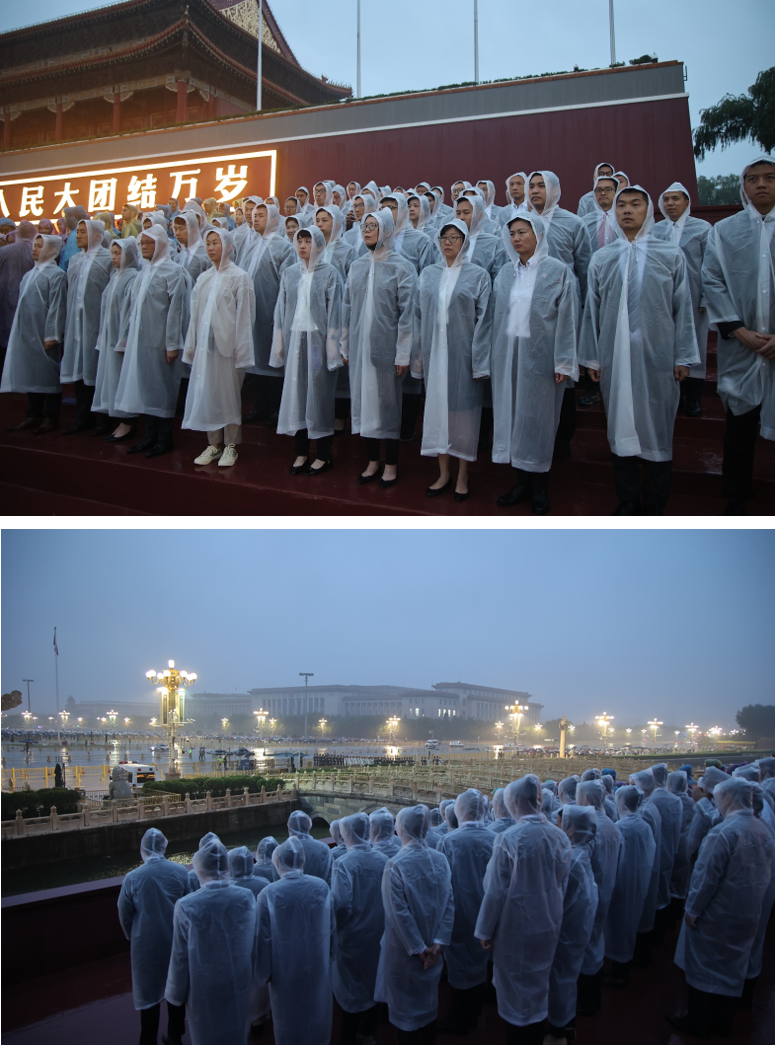 9月9日凌晨,同学们来到天安门广场观礼台观摩了庄严的升旗仪式。雨天并未影响同学们的热情,同学们身披雨衣,身姿挺拔,五时四十九分,伴随着五星红旗冉冉升起,同学们向国旗行注目礼并高唱国歌。