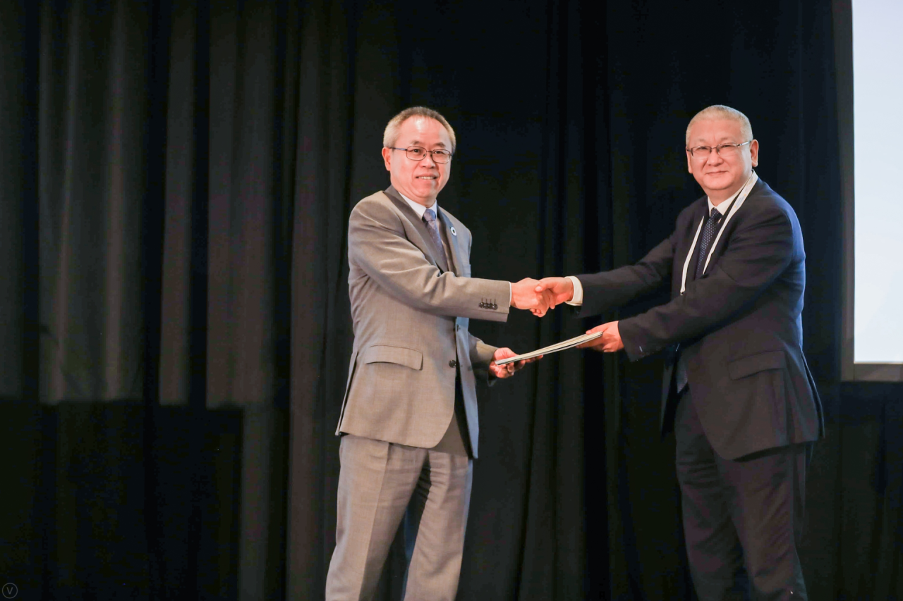 隆基绿能创始人、总裁李振国代表签署企业向李军华副秘书长递送了倡议以及优秀案例