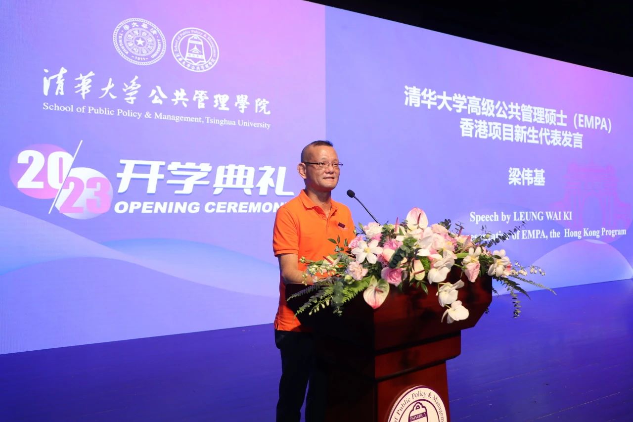 2023级清华大学高级公共管理硕士(EMPA)香港项目新生代表梁伟基发言。梁伟基同学现任香港警务处高级警司,他表示非常荣幸能够和来自香港五个纪律部队的伙伴在清华园内学习。他希望在学习中增补知识,修身立德,达致校训中“自强不息 厚德载物”的君子之道,实现院训中的“明德为公”精神,牢记习近平主席视察香港特别行政区时提出的四点希望,实现民族、国家和香港的更大辉煌。