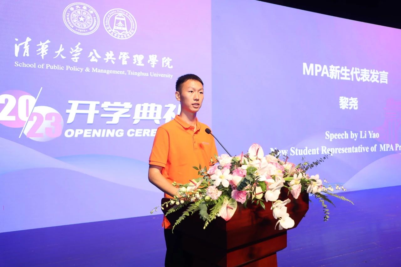 2023级MPA新生代表黎尧发言。黎尧同学现任重庆市永川区消防救援支队萱花站团支部书记、副站长,他提起自己从工作岗位重回校园有三个原因。一是源于对知识的渴求,对理想的期盼;二是源自对实践的思考,对社会的责任;三是源于对人生的探索。希望作为清华公管的一份子,始终与国家和民族同呼吸,共命运。